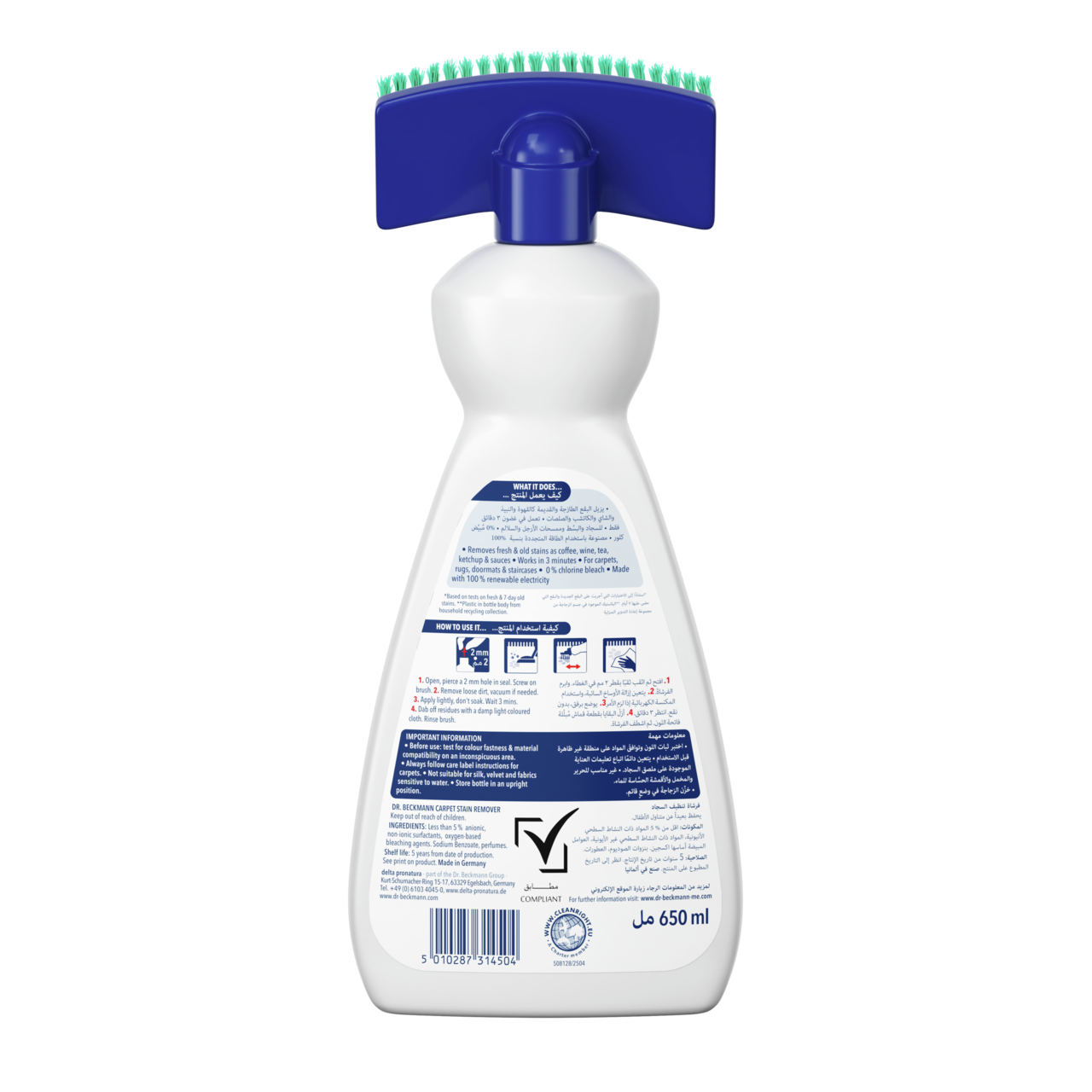 تركيبة تنظيف قوية معززة بتكنولوجيا الأوكسيمن مزيل بقع السجاد من دكتور بيكمان تزيل البقع الجافة والحديثة والقديمة والانسكابات القبيحة، مثل النبيذ الأحمر والقهوة والعصير والكولا والشاي والشحوم والمكياج والطين والأوساخ العميقة. بفضل الفرشاة 2 في 1 المتكاملة مع الإسفنجة والشعيرات، أصبحت مهمتك أسهل من أي وقت مضى، إذ يمكنك استخدامها حتى في المناطق كثيفة الحركة، مثل الممرات ومماسح الأرجل ومفارش السلالم. ومهما كان مقدار الأوساخ، تصل الفرشاة عميقًا إلى الأليافوتنظف سجادتك جيدًا - للحصول على أسطح نظيفة جدًا تبدو وكأنها جديدة. تركيبتنا خالية من مبيض الكلور، وتم اختبارها من قبل أطباء الجلدية.