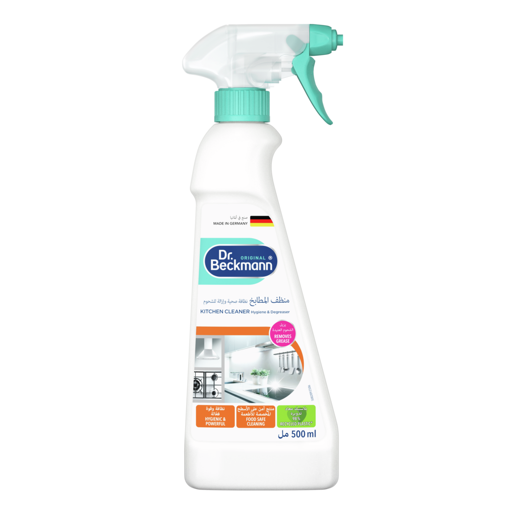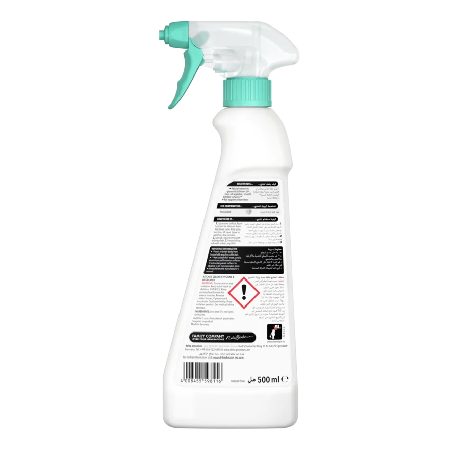 يُعد دكتور بيكمان ﻣﻨﻈﻒ اﻟﻤﻄﺎﺑﺦ ﻧﻈﺎﻓﺔ ﺻﺤﻴﺔ وإزاﻟﺔ ﻟﻠﺸﺤﻮم بخاخًا قويًا لإزالة الزيوت والدهون، مما يجعل تنظيف دهون المطبخ والأوساخ أمرًا سهلاً وسريعًا. كما أن ﻣﻨﻈﻒ اﻟﻤﻄﺎﺑﺦ ﻧﻈﺎﻓﺔ ﺻﺤﻴﺔ وإزاﻟﺔ ﻟﻠﺸﺤﻮم مُصمَّم خصيصًا لتفكيك أصعب بقع الدهون والزيوت. تلتصق الرغوة الفعّالة حتى بالأسطح العمودية. يمكن إزالة بقايا الشحوم العنيدة بفعالية. وفي الوقت نفسه، يكون المنظّف لطيفًا على الأسطح الحسّاسة. لا تحتوي هذه التركيبة على أي مواد كيميائية قاسية أو أمونيا، لذلك لن تترك أي بقايا ضارة على الأسطح. التركيبة مناسبة للأسطح التي تتلامس مع الطعام وتم اختبارها من قبل أطباء الجلدية.