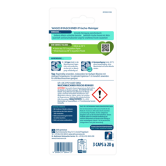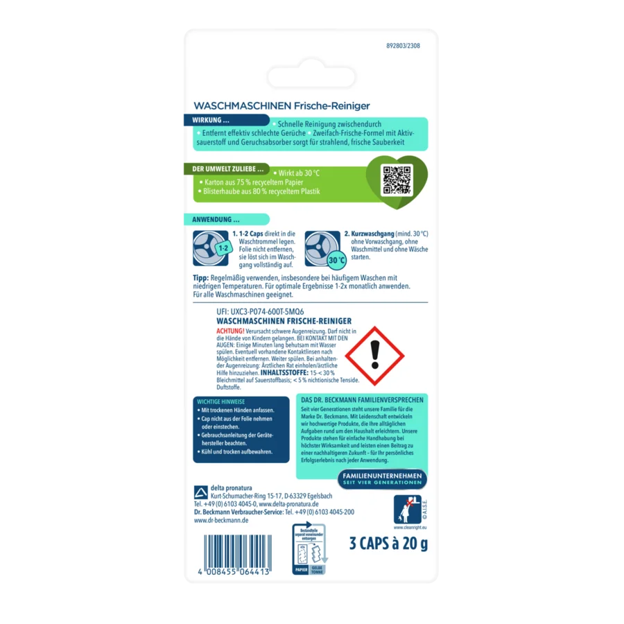 Dr. Beckmann Капсули за освежаване на перални машини са най-добрият отговор за лесно и удобно междинно почистване, дори при бързи цикли на пране. Не е необходимо разопаковане - капсулите от водоразтворимо фолио се използват много лесно. Концентрираната смес с двойна формула за свежест, съдържаща активен кислород и високоефективен абсорбатор на миризми, придава свежест и същевременно премахва неприятните миризми. Очаквайте само ослепителна, свежа чистота!