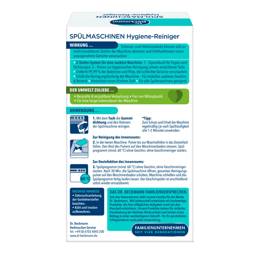 По време на всеки цикъл на измиване мръсотията, мазнините и остатъците могат да се утаят в скрити или труднодостъпни места, като водни дюзи, тръби и тръбопроводи. С течение на времето тези отлагания могат да доведат до неприятни миризми и неизправности. Dr. Beckmann Препарат за почистване и хигиенизиране на съдомиялната защитава Вашия уред с уникалната си двустепенна система: 1. Фугите и уплътненията се почистват със специалната кърпичка. 2. Прахът хигиенично почиства съдомиялната, като премахва мазнините и 99,99% от бактериите и гъбичките, освен това надеждно премахва миризмите. Така ефективността на почистването се запазва.