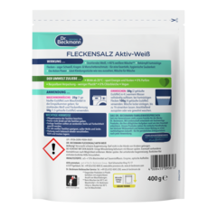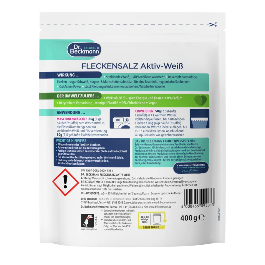 Zejména u výrobků rozpustných ve vodě jsou vodotěsné, vzduchotěsné a znovu uzavíratelné obaly nezbytné pro zachování kvality, trvanlivosti a účinnosti. K tomu je obzvláště vhodný plastový stojací sáček, který se osvědčil a je hojně využíván pro prací prostředky a čisticí prostředky pro domácnost. V porovnání s běžnými přísadami na praní v plastových nádobách (se srovnatelným množstvím pracích dávek na jednotku balení) potřebuje odstraňovač skvrn Dr. Beckmann Power White o 70 % méně obalového materiálu. Již nyní pracujeme na obalových alternativách z ekologicky šetrnějších materiálů, ale bez plastu se bohužel v současné době neobejdeme.