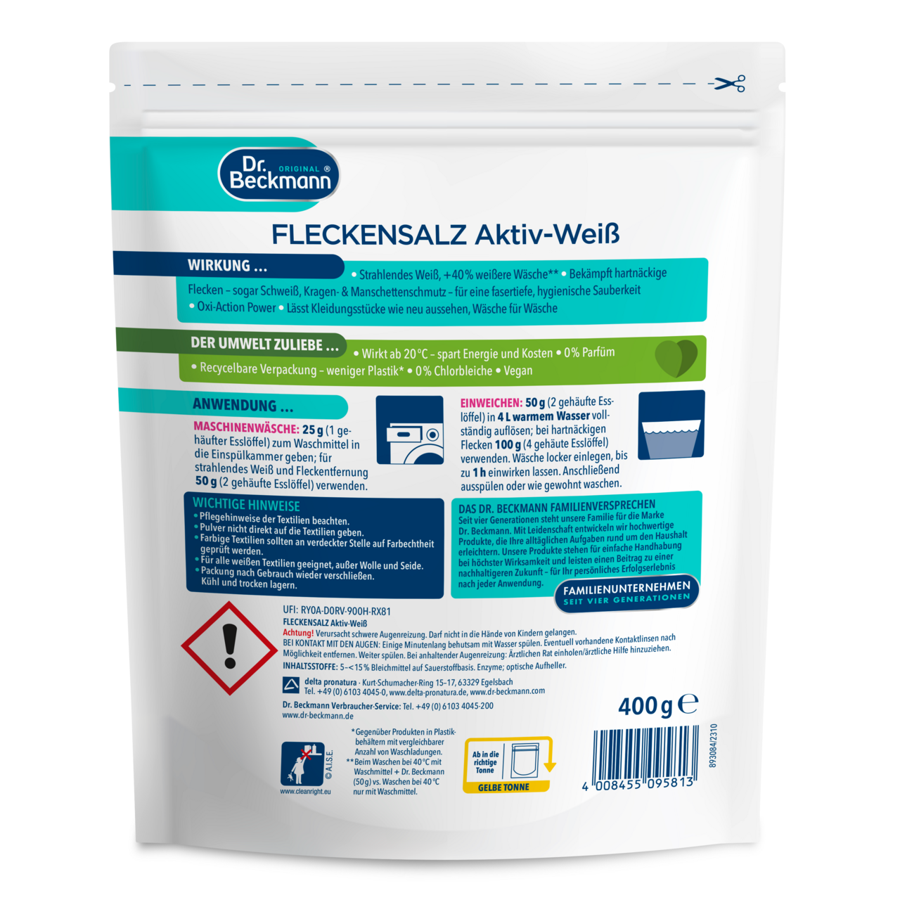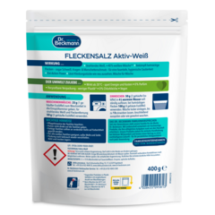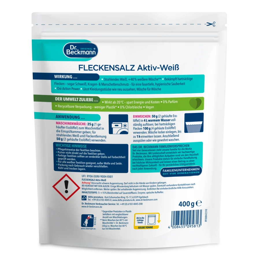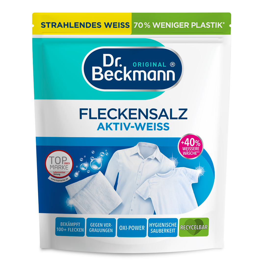 Zejména u výrobků rozpustných ve vodě jsou vodotěsné, vzduchotěsné a znovu uzavíratelné obaly nezbytné pro zachování kvality, trvanlivosti a účinnosti. K tomu je obzvláště vhodný plastový stojací sáček, který se osvědčil a je hojně využíván pro prací prostředky a čisticí prostředky pro domácnost. V porovnání s běžnými přísadami na praní v plastových nádobách (se srovnatelným množstvím pracích dávek na jednotku balení) potřebuje odstraňovač skvrn Dr. Beckmann Power White o 70 % méně obalového materiálu. Již nyní pracujeme na obalových alternativách z ekologicky šetrnějších materiálů, ale bez plastu se bohužel v současné době neobejdeme.