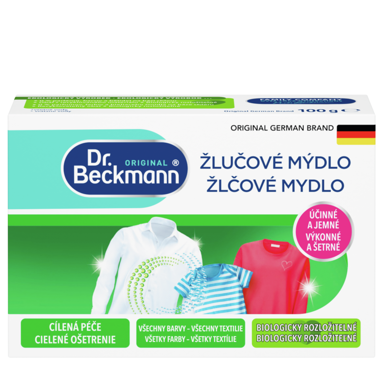 - Žlučové mýdlo Dr. Beckmann vtírejte přímo na skvrnu. Na větší skvrny použijte spodní stranu se strukturou valchy, na cílené odstranění menších skvrn použijte špičatou hranu mýdla.