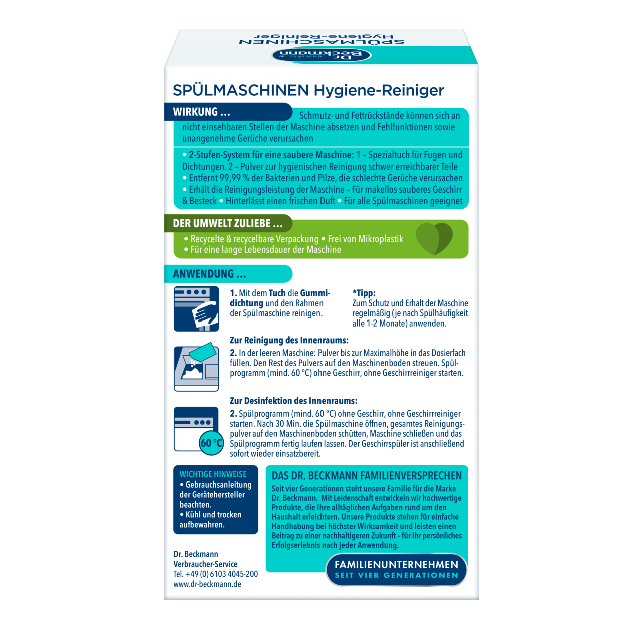 Bei jedem Waschgang können sich Schmutz, Fett und Rückstände an versteckten oder schwer zugänglichen Stellen wie Wasserdüsen, Rohren und Leitungen ablagern. Mit der Zeit können diese Ablagerungen zu unangenehmen Gerüchen und Funktionsstörungen führen. Der Dr. Beckmann Spülmaschinen Hygiene-Reiniger schützt Ihr Gerät mit seinem einzigartigen 2-Stufen-System: 1. Fugen und Dichtungen werden mit dem Spezialtuch gereinigt. 2. Das Pulver reinigt die Spülmaschine hygienisch, entfernt Fett und 99,99% der Bakterien & Pilze und beseitigt zuverlässig Gerüche. So bleibt die Reinigungsleistung erhalten.