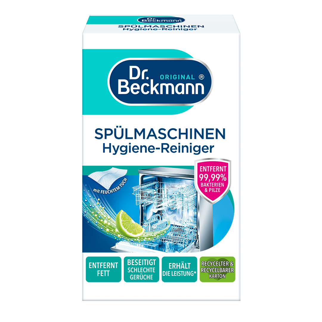 Sie können die Spülmaschine auch in einem heißeren Reinigungsprogramm mit Dr. Beckmann Spülmaschinen Hygiene-Reiniger starten. Je höher die Temperatur beim Reinigen der Spülmaschine, desto besser werden Fett und andere Rückstände entfernt.