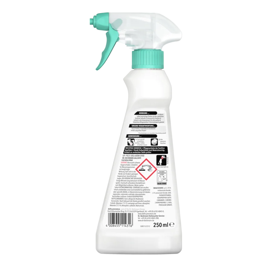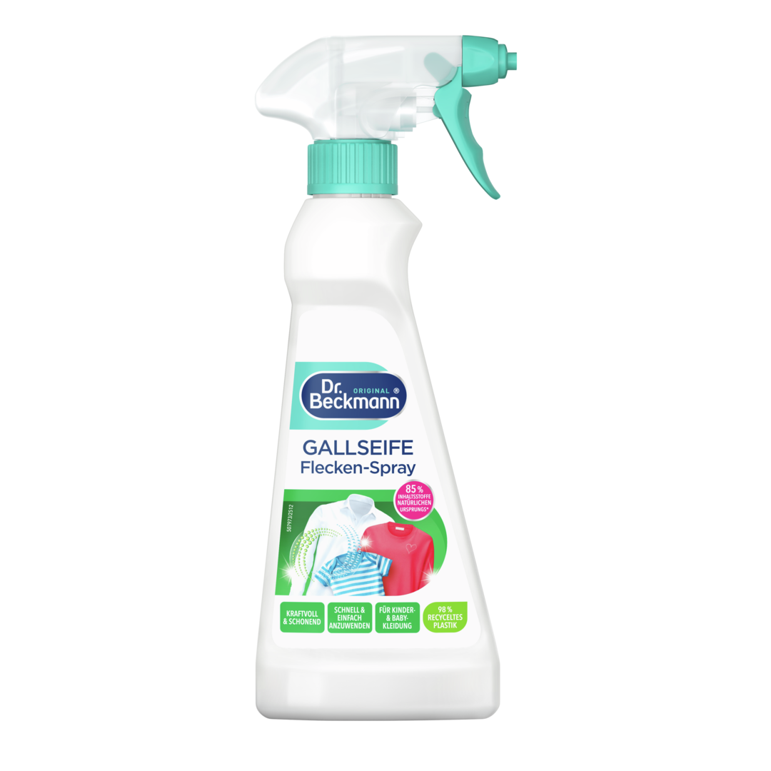 Das Dr. Beckmann Gallseife Flecken-Spray entfernt schnell und zuverlässig selbst hartnäckige Flecken mit der Kraft echter, natürlicher Gallseife. Es beseitigt Flecken von Öl, Saucen, Schokolade, Make-up, Babynahrung, Rotwein, Kaffee, Obst & Gemüse und vielem mehr. Es ist sogar für empfindliche Textilien geeignet. Selbst Flecken auf Wolle und Seide werden vollständig entfernt.