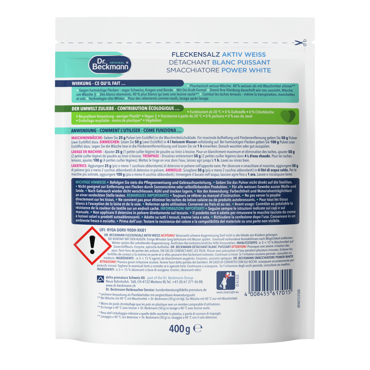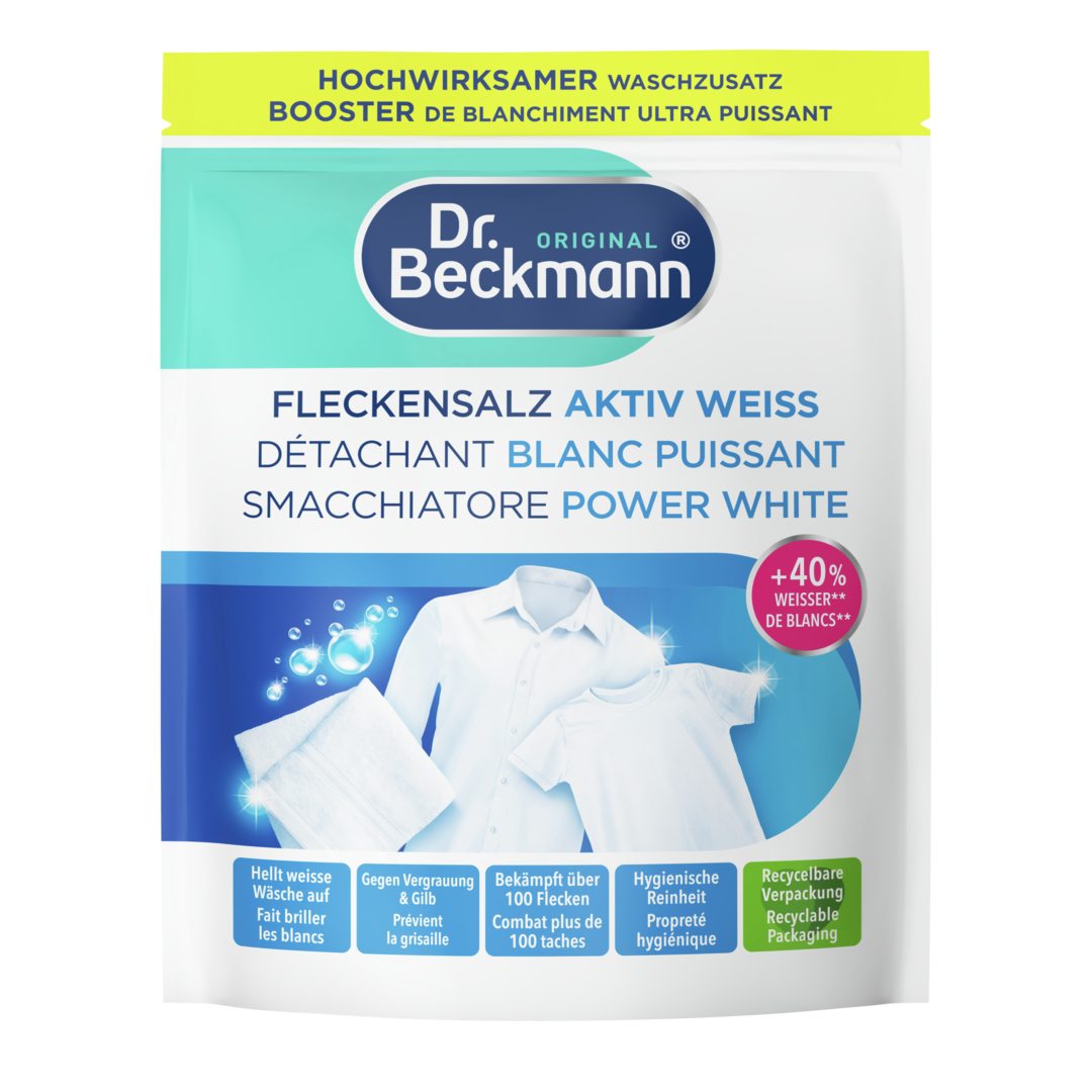 Gerade bei wasserlöslichen Produkten ist eine wasser- und luftdichte, wiederverschließbare Verpackung unerlässlich, um Qualität, Haltbarkeit und Wirksamkeit zu erhalten. Ein Kunststoffbeutel ist hierfür besonders geeignet und hat sich für Wasch- und Reinigungsmittel bewährt und etabliert. Dr. Beckmann Fleckensalz Aktiv Weiss kommt im Vergleich zu herkömmlichen Waschkraftverstärkern in Kunststoffbehältern (bei vergleichbarer Anzahl von Waschladungen pro Verpackungseinheit) bereits mit 70 % weniger Verpackungsmaterial aus. Wir arbeiten bereits an Verpackungsmöglichkeiten aus umweltfreundlicheren Materialien, können aber derzeit leider nicht auf Kunststoff verzichten.