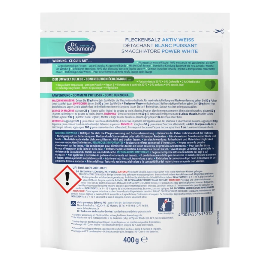 Fleckensalz Aktiv Weiss ist ein hochwirksamer Waschzusatz für strahlendes Weiß. Es schont die Faser und lässt Kleidung und Textilien nach der Anwendung wie neu aussehen. Die leistungsfähige Formel entfernt mehr als 100 verschiedene Flecken. Diese werden bis zu 30 % besser entfernt, als in einem Waschgang nur mit Waschmittel. Das hat ein Vergleichstest im Labor beim Waschen bei 40 °C mit Waschmittel und mit 50 g Fleckensalz Aktiv-Weiß vs. eines Waschgangs bei 40 °C mit Waschmittel und ohne Fleckensalz Aktiv-Weiß ergeben. Die Formel sorgt zudem für tiefe, hygienische Sauberkeit. Das Produkt entfaltet seine Wirkung bereits bei niedrigen Temperaturen ab 20 °C und kann dazu beitragen, Energie und Kosten zu sparen. Es enthält weder Chlorbleiche oder Parfüm.