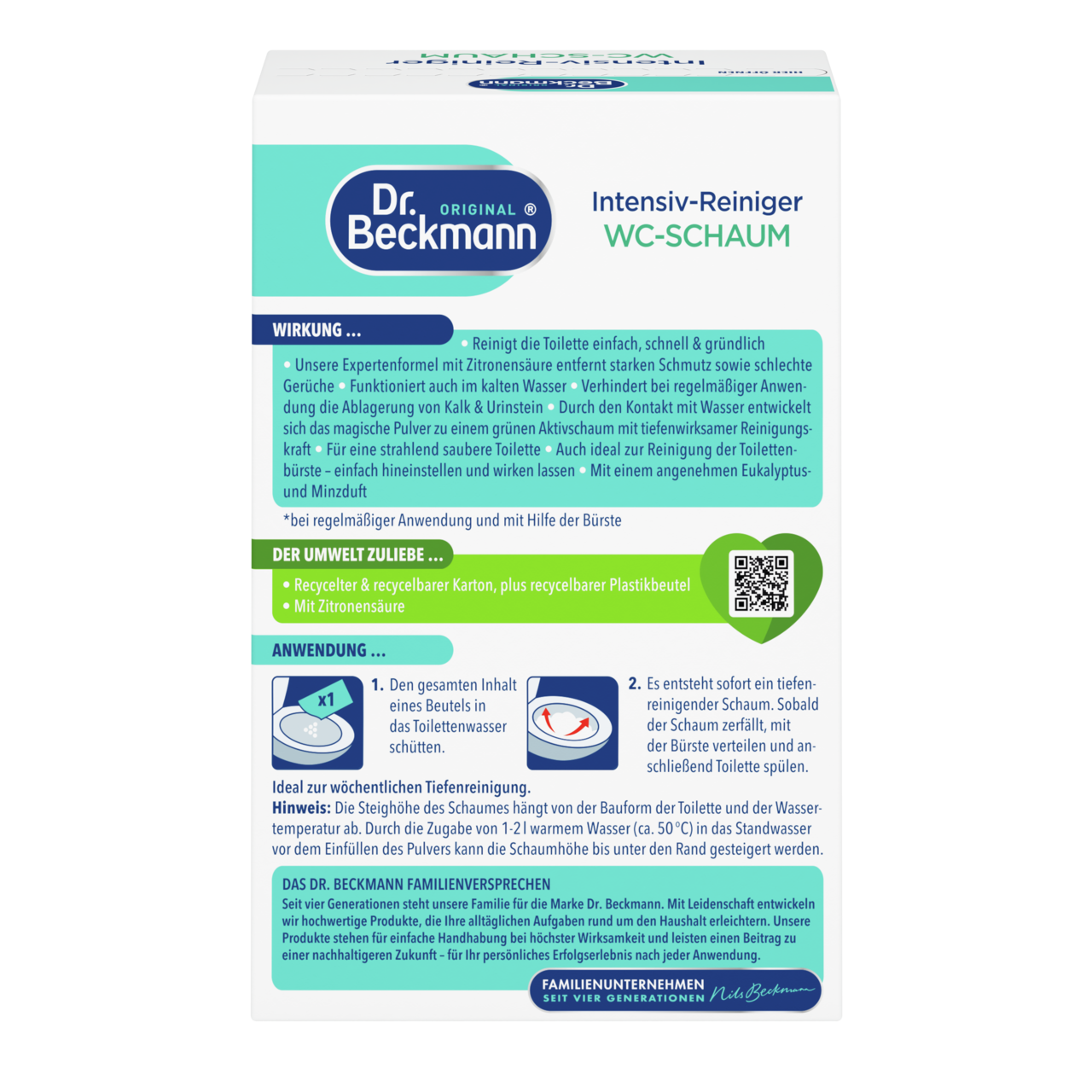 Dr. Beckmann Intensiv-Reiniger WC-Schaum Fresh Eucalyptus reinigt die Toilettenschüssel gründlich und mühelos. Unsere bewährte Formel mit Zitronensäure entfernt hartnäckigen Schmutz und unangenehme Gerüche und verhindert bei regelmäßiger Anwendung Kalk- und Urinsteinablagerungen. Bei Kontakt mit Wasser entwickelt sich das Pulver zu einem tiefenreinigenden, aktiven grünen Schaum. Für eine strahlend saubere Toilette mit angenehmem Eukalyptus-Minz-Duft.