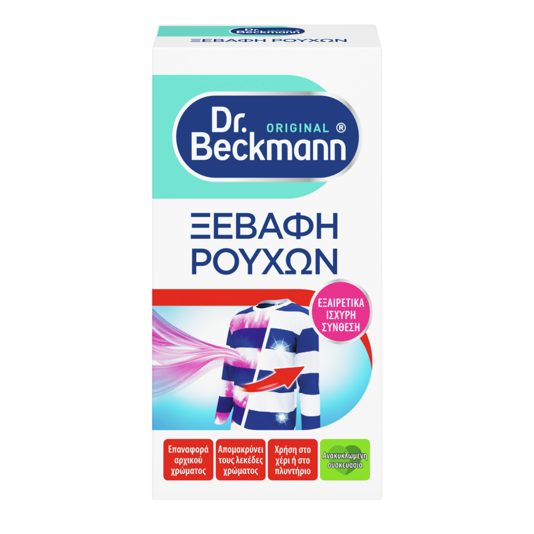 Τα έντονα χρωματιστά ρούχα μπορούν να προκαλέσουν γρήγορα αποχρωματισμούς όταν πλένονται λανθασμένα με άλλα ρούχα. Τα χρώματα διαχέονται και τα υπολείμματα χρώματος απλώνονται σε ολόκληρο το πλυντήριο. Τα αρχικά χρώματα μπορούν να αναπαραχθούν με το Dr. Beckmann Ξεβαφή ρούχων. Ειδικά συστατικά αφαιρούν τους αποχρωματισμούς και εξαφανίζουν τα ανεπιθύμητα χρώματα. Μετά την αφαίρεση του χρώματος, τα ρούχα είναι όπως ήταν προηγουμένως.