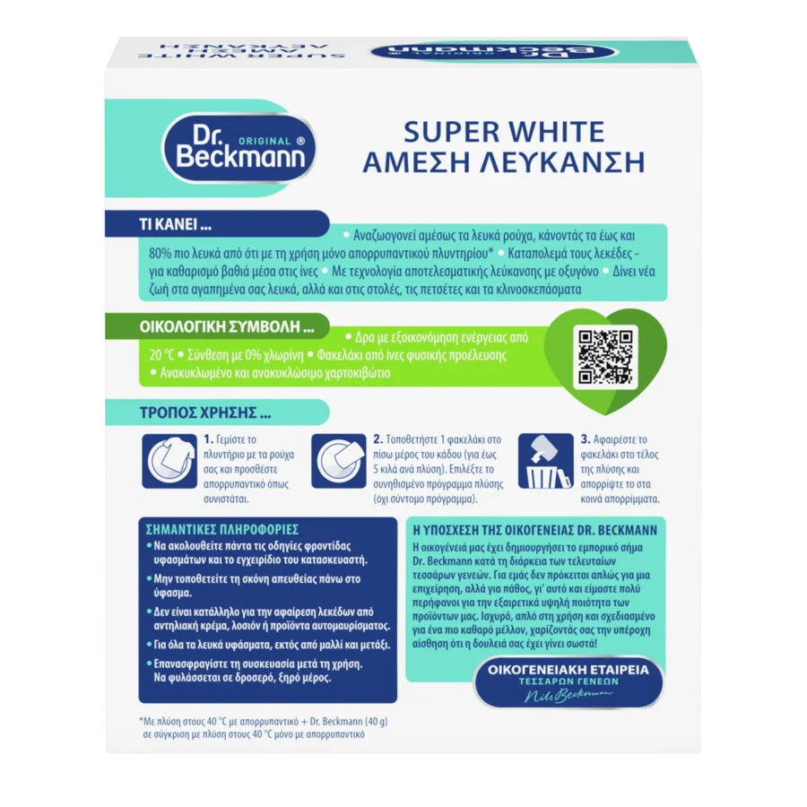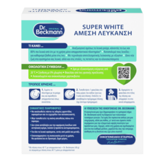 Τα σακουλάκια Dr. Beckmann Super White Aμεση λευκανση αποτρέπουν το γκριζάρισμα, αναζωογονούν τα λευκά και καταπολεμούν τους λεκέδες για βαθύ καθαρισμό των ινών. Με τεχνολογία αποτελεσματικής λεύκανσης με οξυγόνο, διατηρεί τα αγαπημένα σας λευκά ρούχα, τις επαγγελματικές στολές, τις πετσέτες και τα κλινοσκεπάσματά σας σαν καινούργια. Αυτό το προϊόν εντατικής λεύκανσης μπορεί να χρησιμοποιηθεί για να διατηρηθεί η λευκότητα μετά από κάθε πλύσιμο. Τα σακουλάκια Dr. Beckmann Super White Aμεση λευκανση λειτουργούν με εξοικονόμηση ενέργειας στους 20 °C. Επίσης, δεν περιέχεο αρώματα και χλωρίνη. Τα πρακτικά προδοσολογημένα και εύκολα στη χρήση φακελάκια είναι κατασκευασμένα από ίνες φυσικής προέλευσης. Διατίθενται σε ανακυκλωμένο και ανακυκλώσιμο χαρτοκιβώτιο.