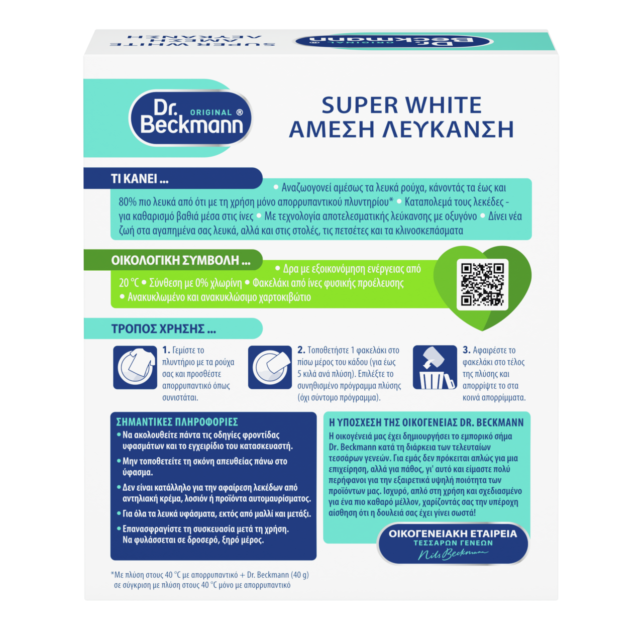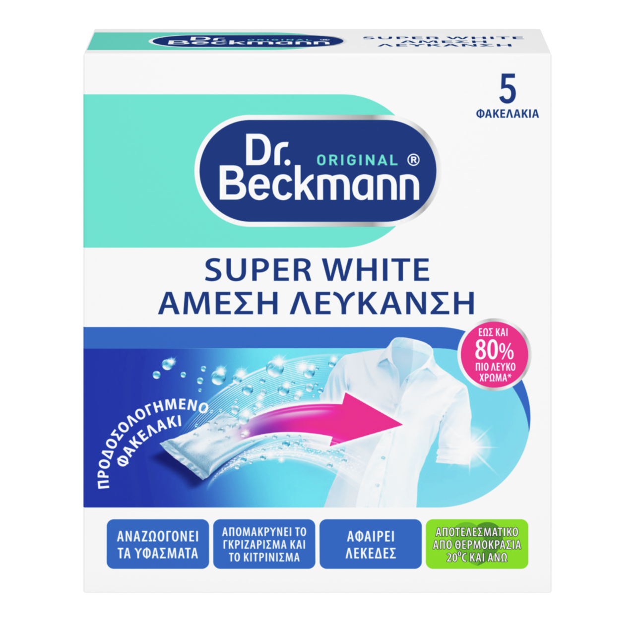 Τα σακουλάκια Dr. Beckmann Super White Aμεση λευκανση αποτρέπουν το γκριζάρισμα, αναζωογονούν τα λευκά και καταπολεμούν τους λεκέδες για βαθύ καθαρισμό των ινών. Με τεχνολογία αποτελεσματικής λεύκανσης με οξυγόνο, διατηρεί τα αγαπημένα σας λευκά ρούχα, τις επαγγελματικές στολές, τις πετσέτες και τα κλινοσκεπάσματά σας σαν καινούργια. Αυτό το προϊόν εντατικής λεύκανσης μπορεί να χρησιμοποιηθεί για να διατηρηθεί η λευκότητα μετά από κάθε πλύσιμο. Τα σακουλάκια Dr. Beckmann Super White Aμεση λευκανση λειτουργούν με εξοικονόμηση ενέργειας στους 20 °C. Επίσης, δεν περιέχεο αρώματα και χλωρίνη. Τα πρακτικά προδοσολογημένα και εύκολα στη χρήση φακελάκια είναι κατασκευασμένα από ίνες φυσικής προέλευσης. Διατίθενται σε ανακυκλωμένο και ανακυκλώσιμο χαρτοκιβώτιο.