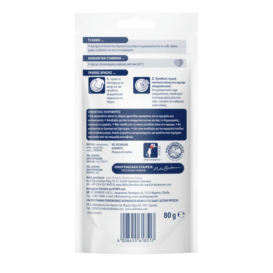 Η σκόνη Dr. Beckmann Glowhite διατηρεί τη λάμψη των λευκών σας, χωρίς να βλάπτει τις ίνες ή τα υφάσματα. Ιδανικό για χρήση σε κάθε πλύση για να απολαμβάνετε φωτεινά λευκά ρούχα. Είναι αποτελεσματικό για όλα τα υφάσματα, όλους τους κύκλους πλύσης και όλες τις θερμοκρασίες, ακόμη και στους 20 °C.