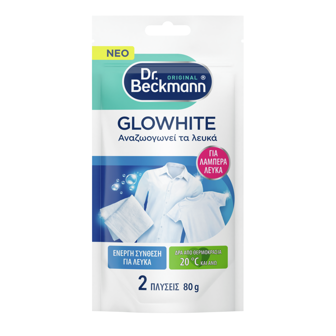 Η σκόνη Dr. Beckmann Glowhite διατηρεί τη λάμψη των λευκών σας, χωρίς να βλάπτει τις ίνες ή τα υφάσματα. Ιδανικό για χρήση σε κάθε πλύση για να απολαμβάνετε φωτεινά λευκά ρούχα. Είναι αποτελεσματικό για όλα τα υφάσματα, όλους τους κύκλους πλύσης και όλες τις θερμοκρασίες, ακόμη και στους 20 °C.