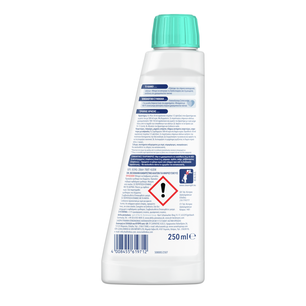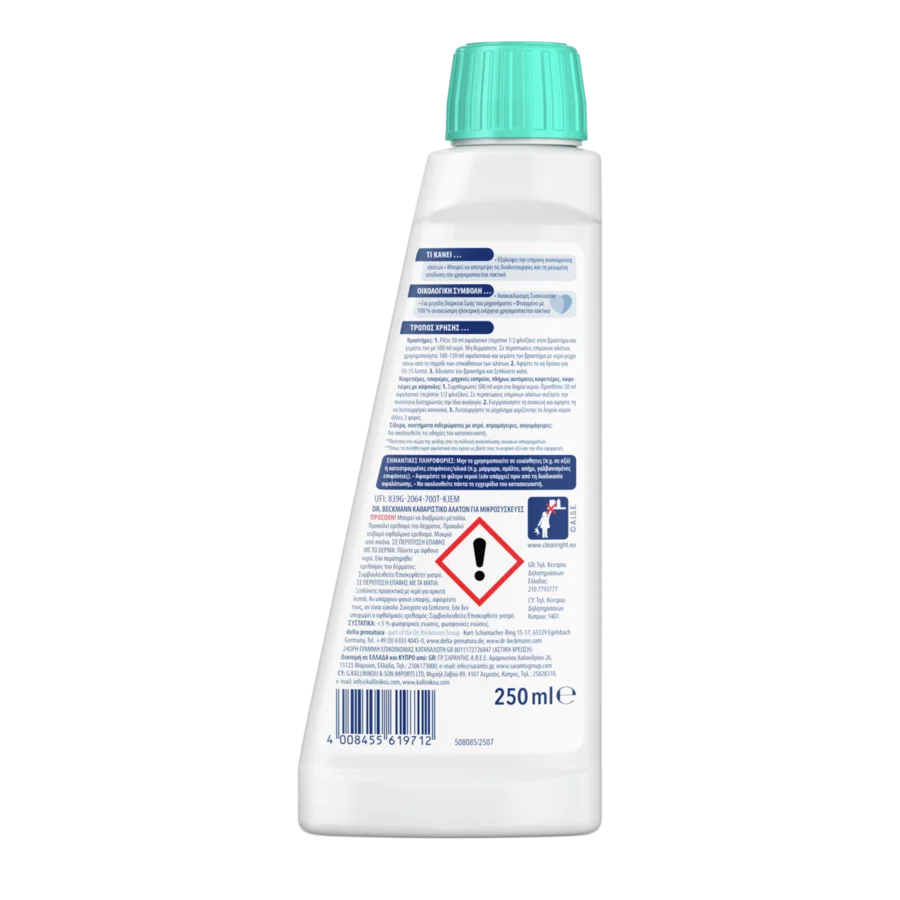 Οι επικαθήσεις αλάτων δεν είναι μόνο αντιαισθητικές, αλλά μπορούν επίσης να επηρεάσουν αρνητικά την απόδοση και να αυξήσουν την κατανάλωση ενέργειας της συσκευής. Η φόρμουλα του Dr. Beckmann Καθαριστικό αλάτων για μικροσυσκευές έχει αποδειχθεί ότι απομακρύνει τα άλατα καλύτερα από το κιτρικό οξύ, εξασφαλίζοντας γρήγορη και αποτελεσματική αφαλάτωση. Έτσι, για παράδειγμα, πέρα από τους βραστήρες, μπορείτε να απαλλάξετε τις αυτόματες καφετιέρες για κάψουλες από άλατα και να τις προστατεύσετε από δυσλειτουργίες. Το Καθαριστικό αλάτων για μικροσυσκευές μπορεί να αποτρέψει δυσλειτουργίες και μειωμένη απόδοση εάν χρησιμοποιείται τακτικά.
