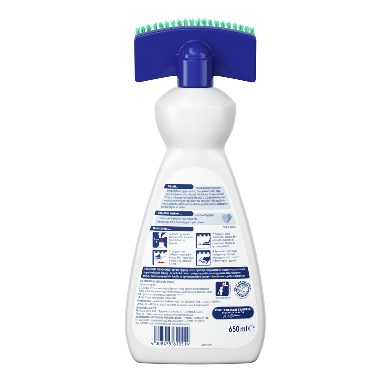Η ισχυρή καθαριστική φόρμουλα με βάση το οξυγόνο του Dr. Beckmann Καθαριστικό χαλιών εξαλείφει φρέσκους και παλιούς λεκέδες που έχουν στεγνώσει, καθώς και δυσάρεστες κηλίδες από κόκκινο κρασί, καφέ, χυμό, κόλα, τσάι, λίπος, μακιγιάζ, λάσπη και ακόμη και λεκέδες από κατοικίδια, όπως ούρα. Χάρη στην ενσωματωμένη βούρτσα 2 σε 1 που συνδυάζει σφουγγάρι και τρίχες, ο καθαρισμός είναι πιο εύκολος από ποτέ και μπορείτε να χρησιμοποιήσετε το προϊόν ακόμη και σε χώρους υψηλής επισκεψιμότητας, όπως διάδρομοι, είσοδοι και σκάλες. Ανεξάρτητα από τον τύπο της ακαθαρσίας, η βούρτσα εισχωρεί βαθιά στις ίνες και καθαρίζει επιμελώς το χαλί – για πραγματικά καθαρισμένες σε βάθος επιφάνειες που μοιάζουν σαν καινούργιες. Η σύνθεσή μας δεν περιέχει χλωρίνη και είναι δερματολογικά ελεγμένη.