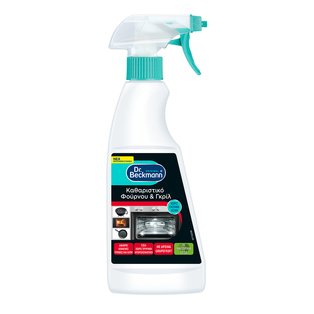 Kαθαριστικό φούρνου & γκριλ με μαγειρική σόδα αφαιρεί επίμονες επικαθίσεις, καψίματα και λεκέδες από λίπος. Η σύνθεση τζελ, η οποία προσκολλάται και σε κάθετες επιφάνειες, διεισδύει στα κατώτερα στρώματα ακόμη και των πιο δύσκολων λεκέδων και είναι ήπια για τις επιφάνειες. Το Dr. Beckmann Kαθαριστικό φούρνου & γκριλ είναι επίσης κατάλληλο για σχάρες ψησίματος, τηγάνια και τζάκια. Είναι ασφαλές για τρόφιμα, δεν προκαλεί επιβλαβείς αναθυμιάσεις και έχει ευχάριστη μυρωδιά γκρέιπφρουτ.