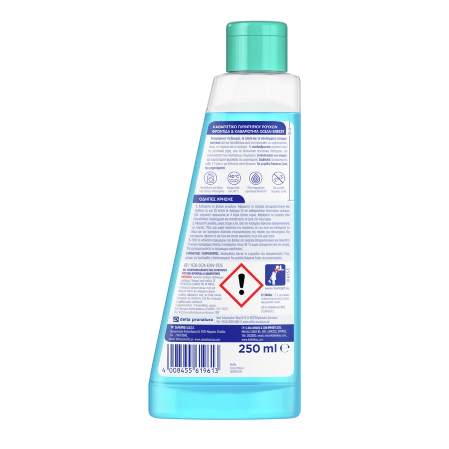 Το Kαθαριστικό πλυντηρίου ρούχων φροντίδα & καθαριότητα καθαρίζει σχολαστικά και αξιόπιστα και αφαιρεί τα άλατα, τη βρωμιά και τις αποθέσεις, ακόμη και σε δυσπρόσιτα σημεία του μηχανήματος. Επιπλέον, οι αντιδιαβρωτικοί παράγοντες προστατεύουν τα μεταλλικά εξαρτήματα και τα βελτιωτικά συστατικά διατηρούν ελαστικά τα λάστιχα της πόρτας. Το σύγχρονο άρωμα Ocean Breeze® αφήνει ένα άρωμα φρεσκάδας που διαρκεί χάρη στην τεχνολογία Neofresh και εξαλείφει τις δυσάρεστες οσμές. Κατάλληλο για τον εσωτερικό (κάδος, σωλήνες κ.λπ.) και τον εξωτερικό καθαρισμό (συρτάρι απορρυπαντικού, τζάμι, λάστιχο κ.λπ.) του πλυντηρίου ρούχων. Για μεγάλη διάρκεια ζωής του μηχανήματος.