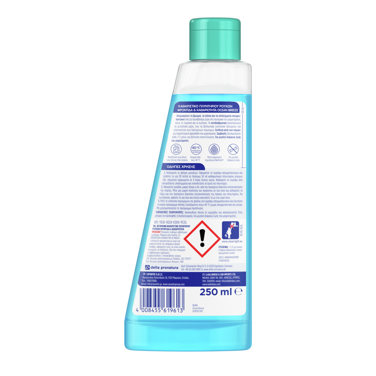 Το Kαθαριστικό πλυντηρίου ρούχων φροντίδα & καθαριότητα καθαρίζει σχολαστικά και αξιόπιστα και αφαιρεί τα άλατα, τη βρωμιά και τις αποθέσεις, ακόμη και σε δυσπρόσιτα σημεία του μηχανήματος. Επιπλέον, οι αντιδιαβρωτικοί παράγοντες προστατεύουν τα μεταλλικά εξαρτήματα και τα βελτιωτικά συστατικά διατηρούν ελαστικά τα λάστιχα της πόρτας. Το σύγχρονο άρωμα Ocean Breeze® αφήνει ένα άρωμα φρεσκάδας που διαρκεί χάρη στην τεχνολογία Neofresh και εξαλείφει τις δυσάρεστες οσμές. Κατάλληλο για τον εσωτερικό (κάδος, σωλήνες κ.λπ.) και τον εξωτερικό καθαρισμό (συρτάρι απορρυπαντικού, τζάμι, λάστιχο κ.λπ.) του πλυντηρίου ρούχων. Για μεγάλη διάρκεια ζωής του μηχανήματος.