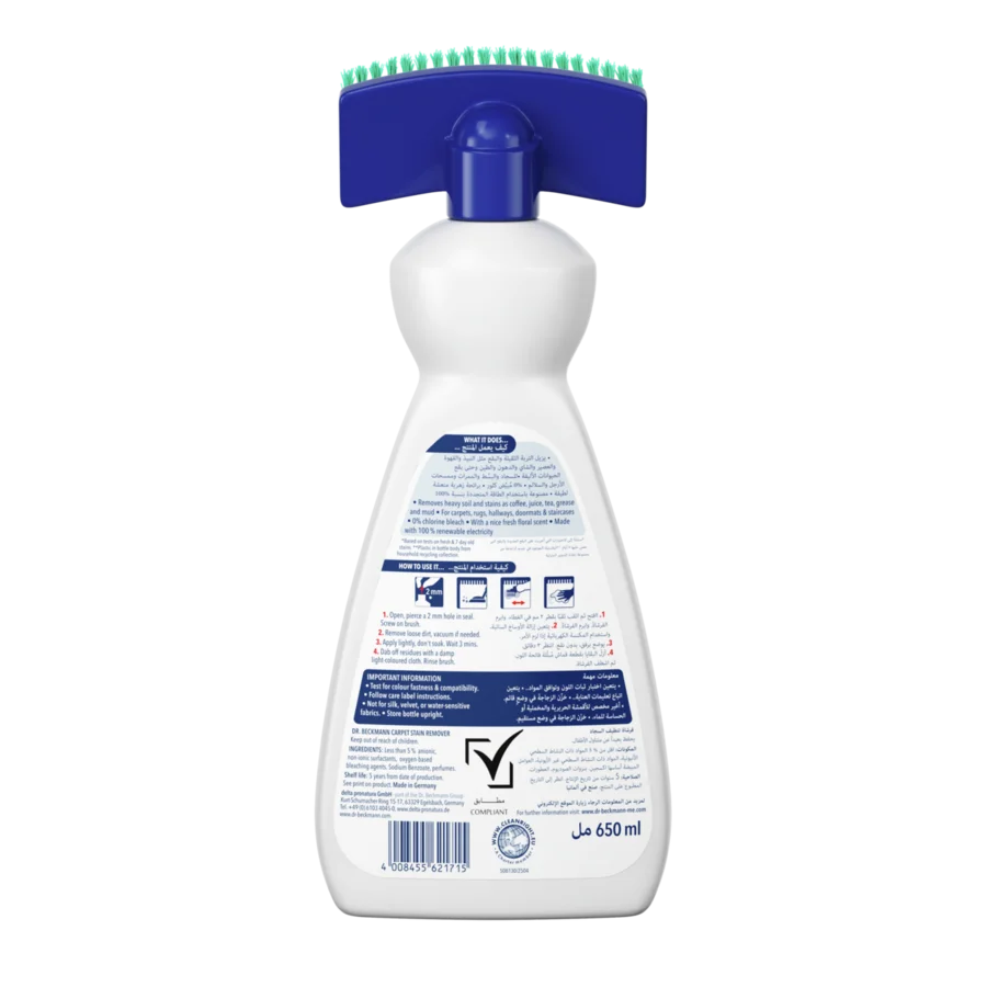 The powerful oxi-based cleaning formula of Dr. Beckmann Carpet Stain Remover Violet Blossom eliminates fresh & old dried-in stains and unsightly spills such as red wine, coffee, juice, cola, tea, grease, mud & deep-down dirt. Thanks to the integrated 2in1 brush with sponge and bristles your job is easier than ever, so you can use it even on high traffic areas as hallways, doormats & staircases. Whatever the mess, the brush gets deep into the fibres and cleans your carpet thoroughly - for really deep-cleaned surfaces looking like new. And because it comes with a pleasant Violet Blossom scent, cleaning is even more pleasurable. Our formula is free from chlorine bleach and is dermatologically tested.How to use it
