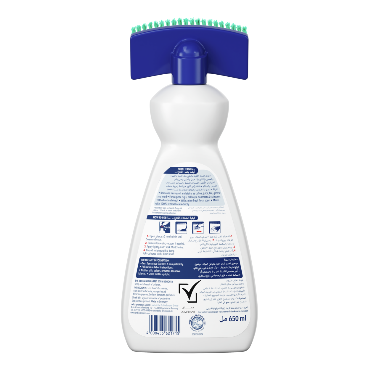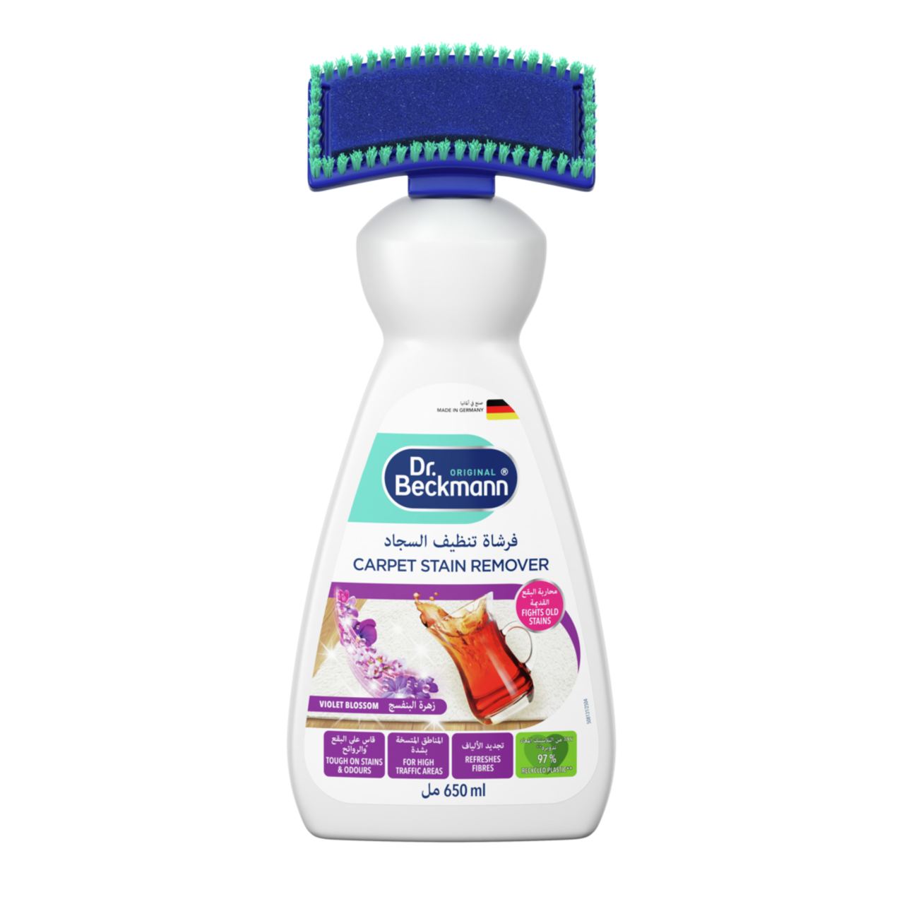 The powerful oxi-based cleaning formula of Dr. Beckmann Carpet Stain Remover Violet Blossom eliminates fresh & old dried-in stains and unsightly spills such as red wine, coffee, juice, cola, tea, grease, mud & deep-down dirt. Thanks to the integrated 2in1 brush with sponge and bristles your job is easier than ever, so you can use it even on high traffic areas as hallways, doormats & staircases. Whatever the mess, the brush gets deep into the fibres and cleans your carpet thoroughly - for really deep-cleaned surfaces looking like new. And because it comes with a pleasant Violet Blossom scent, cleaning is even more pleasurable. Our formula is free from chlorine bleach and is dermatologically tested.How to use it
