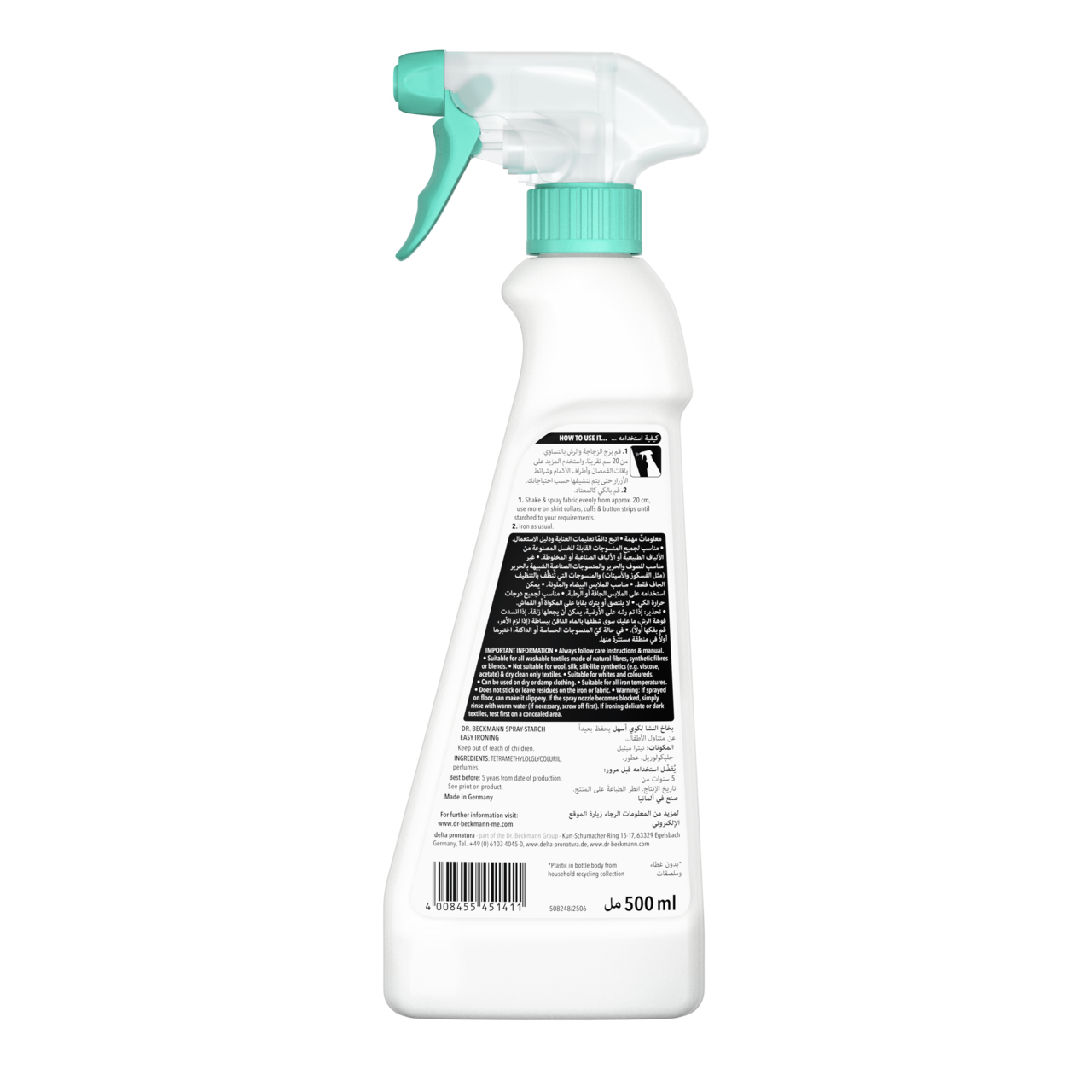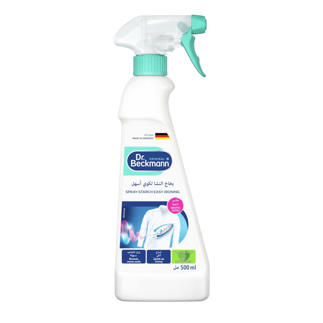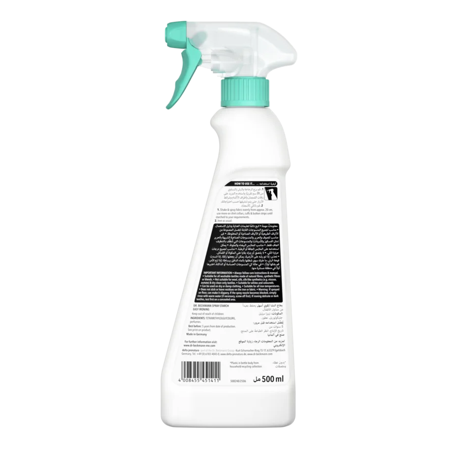 Dr. Beckmann Spray Starch Easy Ironing combines two effective processes in one, making ironing easier than ever. The innovative formula creates natural tension, and simultaneously ensures easy smoothing of stubborn creases and wrinkles. You can even remove ironed-in creases, and the flattening of fibres helps prevent new wrinkles as well as repelling dirt. Gives your textiles perfect, controlled body and a crease-free finish for a well-groomed look and comfortable feel.