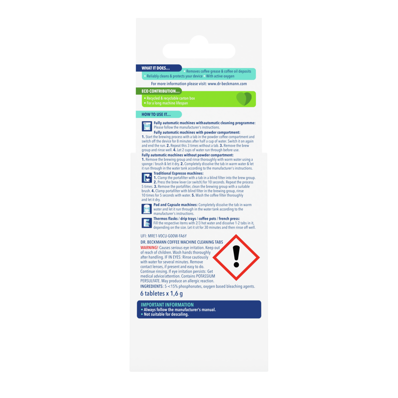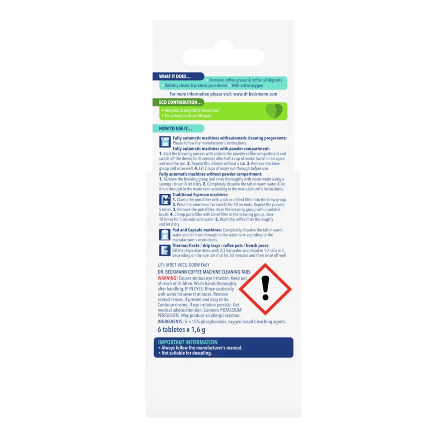 For perfect coffee enjoyment and a long service life of the coffee machine, it is important to clean the device regularly. This is because every time the coffee machine is used, coffee fats and oils are deposited, which can impair the functioning of the device. Dr. Beckmann Coffee Machine Cleaning Tabs remove any coffee grease residues and reliably protect your coffee machine in the process.