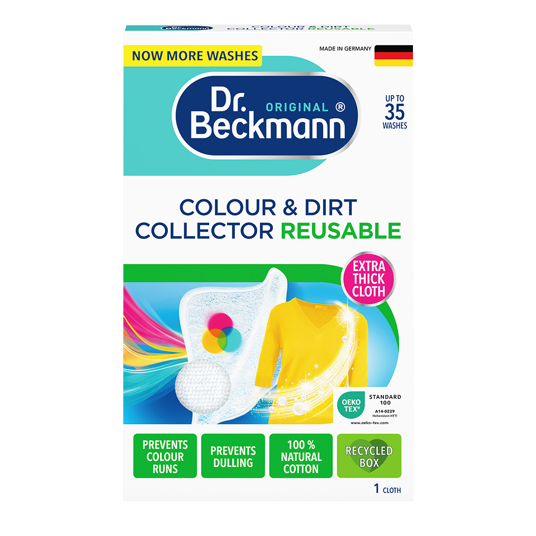 When you wash your garments colour and dirt can be released into the water. If not collected, this can end up on your garments and discoloration & greying can occur. And with frequent washes, clothes often lose their luminosity. The Dr. Beckmann Colour & Dirt Collector Reusable acts like a magnet and traps loose dye from the water, ensuring ultimate protection from unsightly colour runs & dulling. The special extra large & fluffy cloth is made of 100% natural cotton and is a convenient & sustainable alternative to conventional sheets. It is powered by a colour catch technology which ensures reliable colour absorption. The unique colour-lock system locks colour permanently in the cloth, so it can be reused without worries up to 35 times. Now you can easily do your mixed washes - even with dark and white clothes. This also means less laundry sorting and wash loads, helping the environment by saving water and energy. For garments looking like new, wash after wash.
