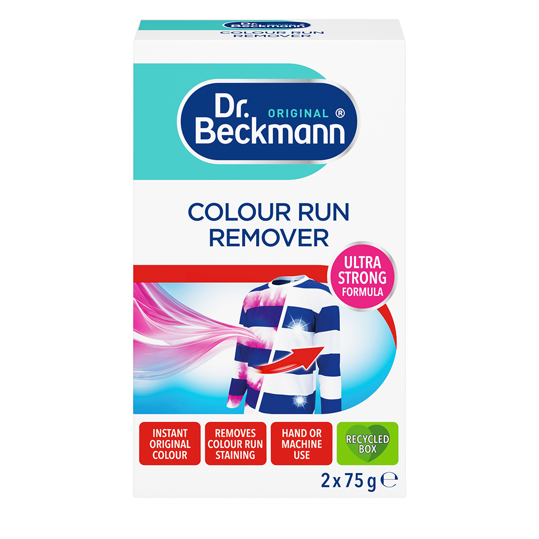 Colour intensive garments can quickly cause discolourations when they are mistakenly washed with other garments. The colours bleed out and distribute the colour residue onto the entire laundry. The original colours can be re-created with Dr. Beckmann Colour Run Remover. Special ingredients remove the discolourations and destroy the unwanted colours. After the colour removal, the garments look as they did before.