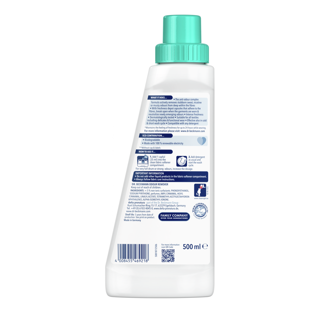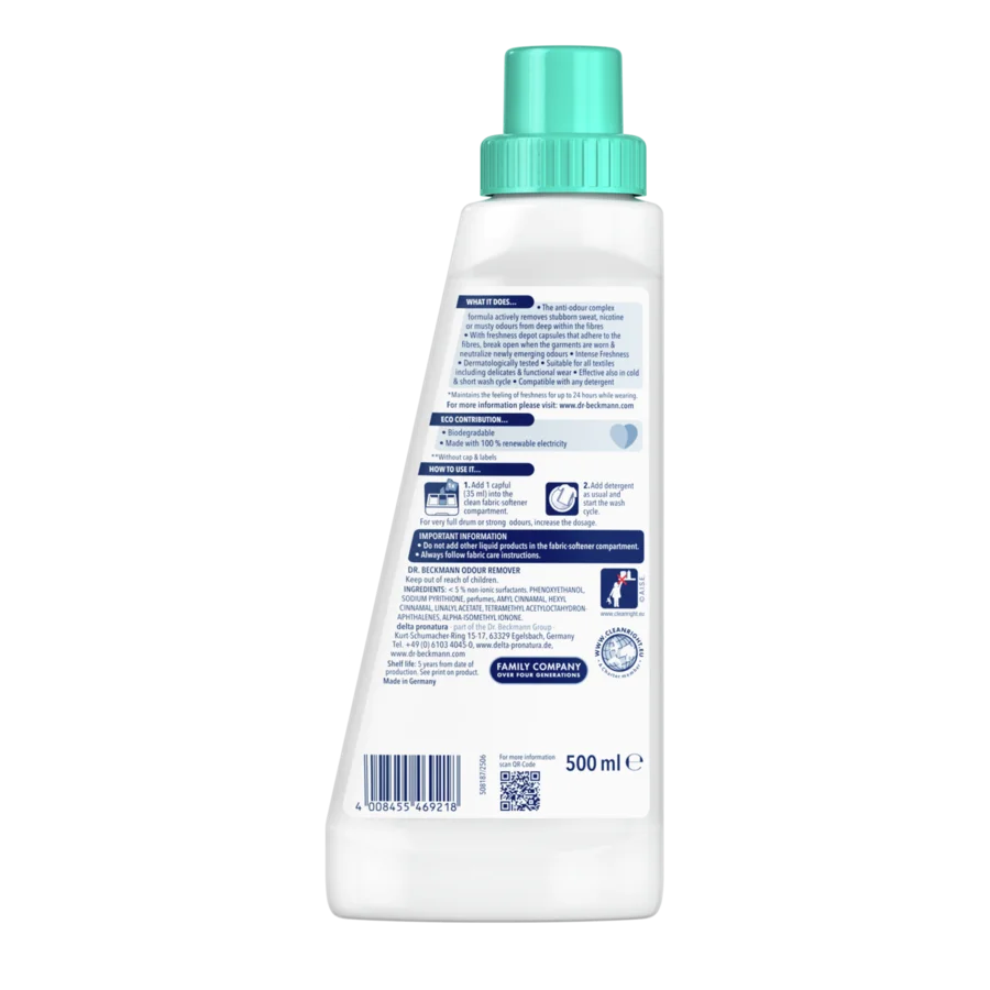Dr. Beckmann Odour Remover contains an anti-odour formula that actively removes stubborn odours from deep within the fibres of the fabric. Freshness depot capsules attach to the fibres and break open when the garments are worn, neutralizing newly emerging odours before they can attach to the fibres.