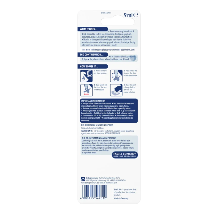 The Dr. Beckmann Stain Pen express can be an easy solution for all stains that can develop on the go. Fresh stains can be easily removed through a combination of surfactants and active oxygen. The cleaning tip of the pen enables a targeted treatment of a stain, and after it has been washed off it can be used again for the next stain without leaving any residues.