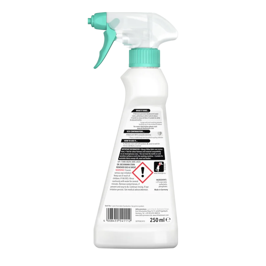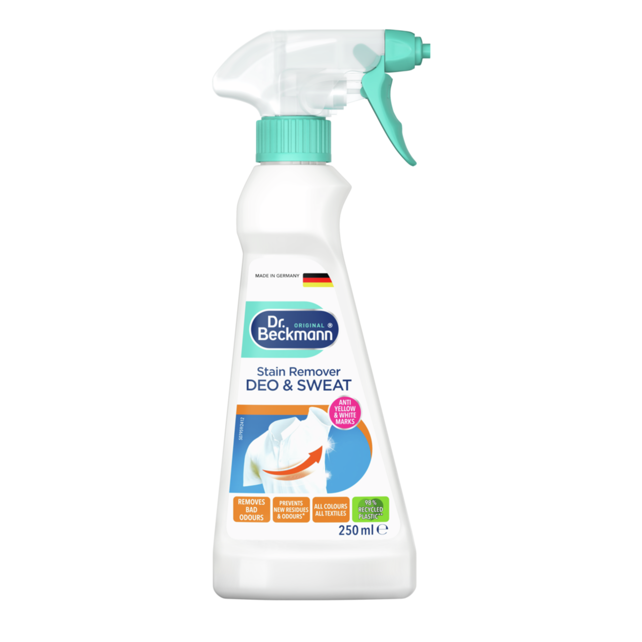 Dr. Beckmann Stain Remover Deo & Sweat contains active oxygen, which penetrates deep into the fibres of the fabric to remove stubborn stains and odours.