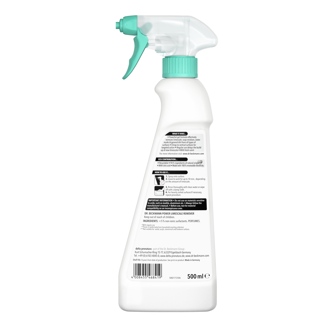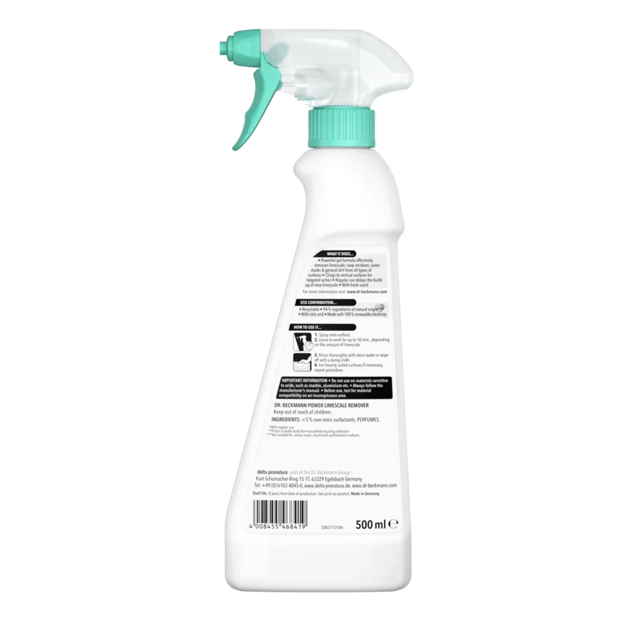 Dr. Beckmann Power Limescale Remover is an easy-to-use gel spray that effectively combats and removes limescale, soap residues, water marks and general dirt from all types of surfaces. It clings to the surface when sprayed, so that it can work effectively where needed. Regular usage delays the build-up of new limescale. It's suitable for use on all metals including stainless steel, copper and brass.