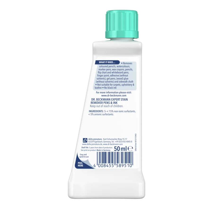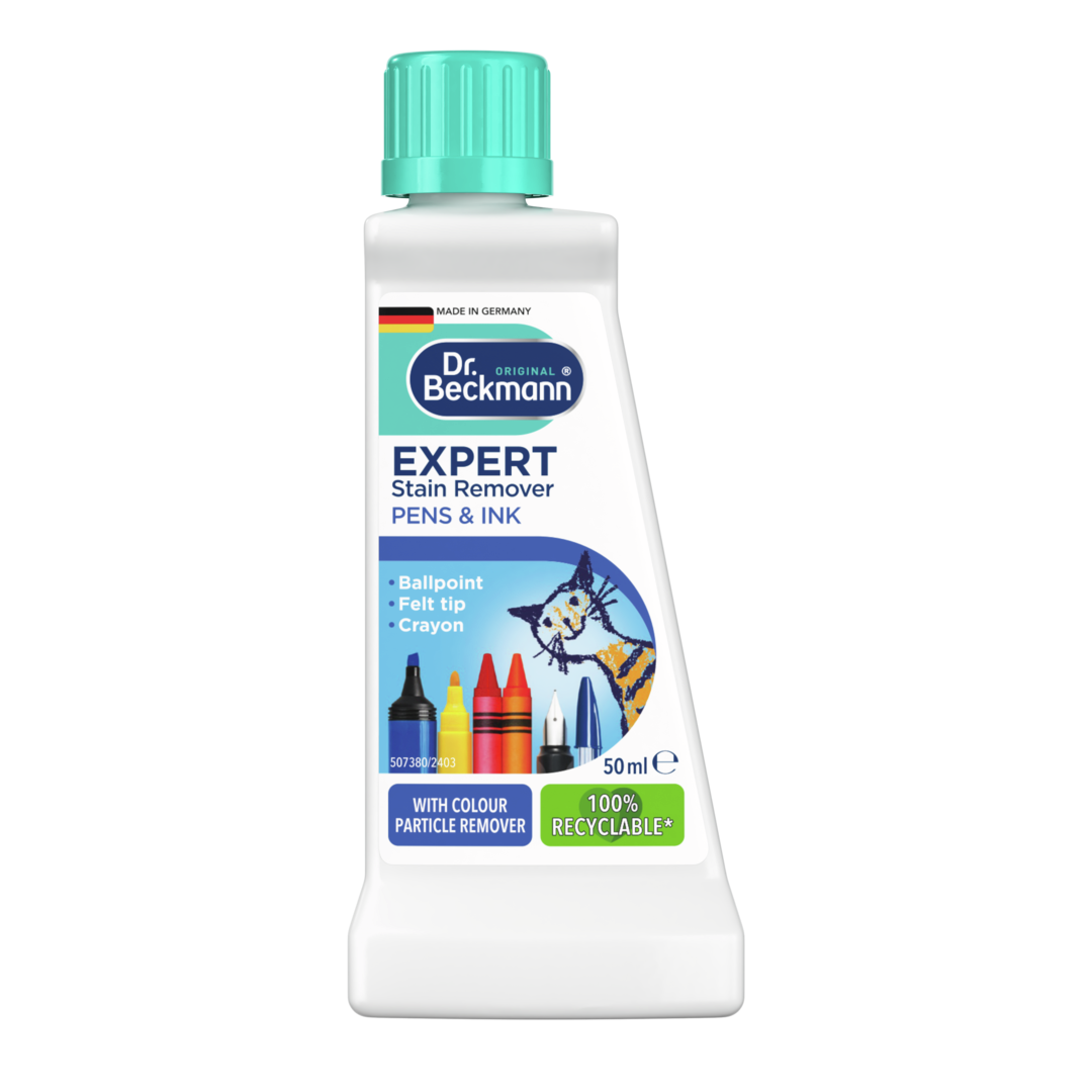 The customized formula of the Dr. Beckmann Expert Stain Remover Pens & Ink considers the special characteristics of stains caused by ballpoint pens, other pens, or watercolours. With the help of a colour-particle remover in the liquid, the colour pigments are separated and removed from the fabric.