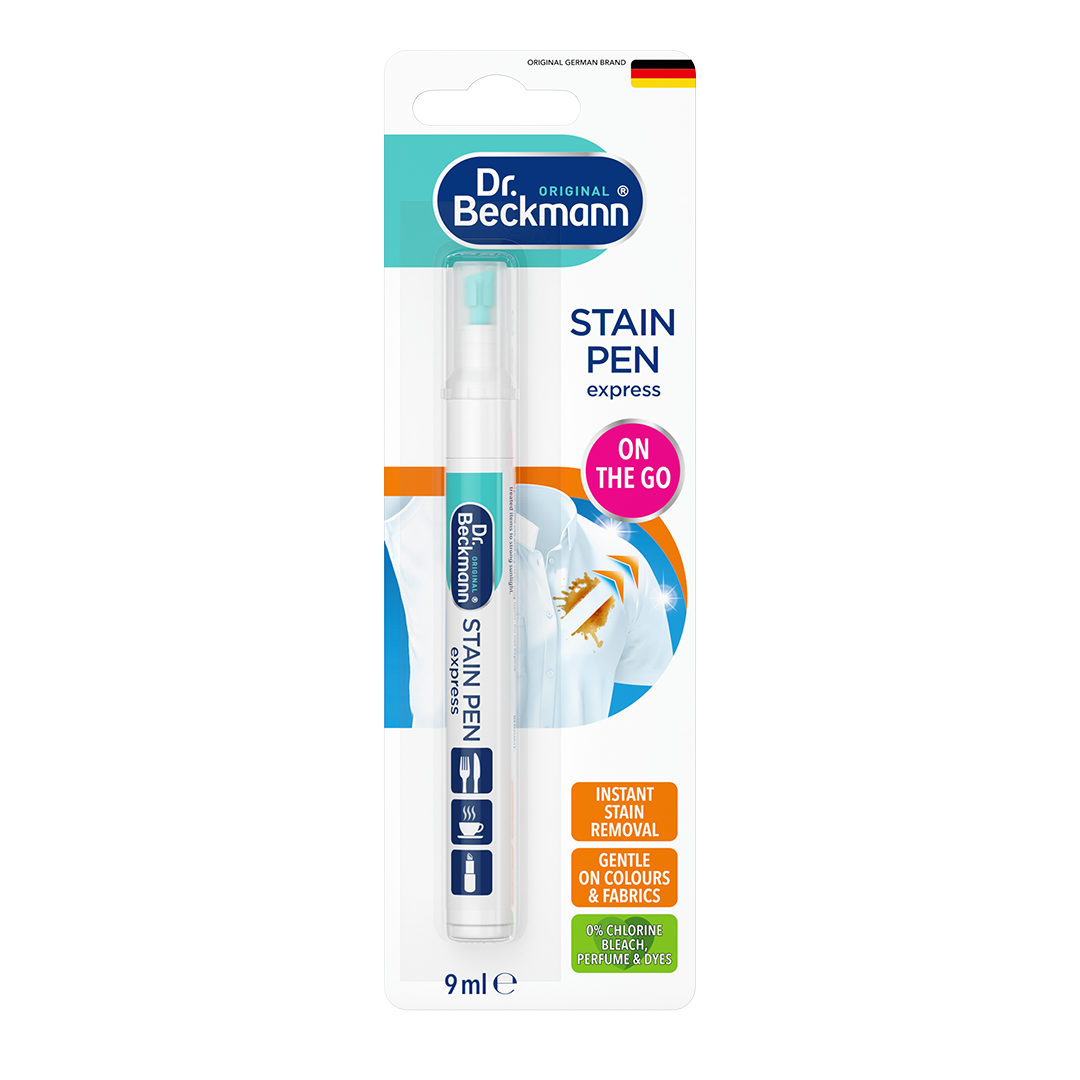 The Dr. Beckmann Stain Pen express can be an easy solution for all stains that can develop on the go. Fresh stains can be easily removed through a combination of surfactants and active oxygen. The cleaning tip of the pen enables a targeted treatment of a stain, and after it has been washed off it can be used again for the next stain without leaving any residues.