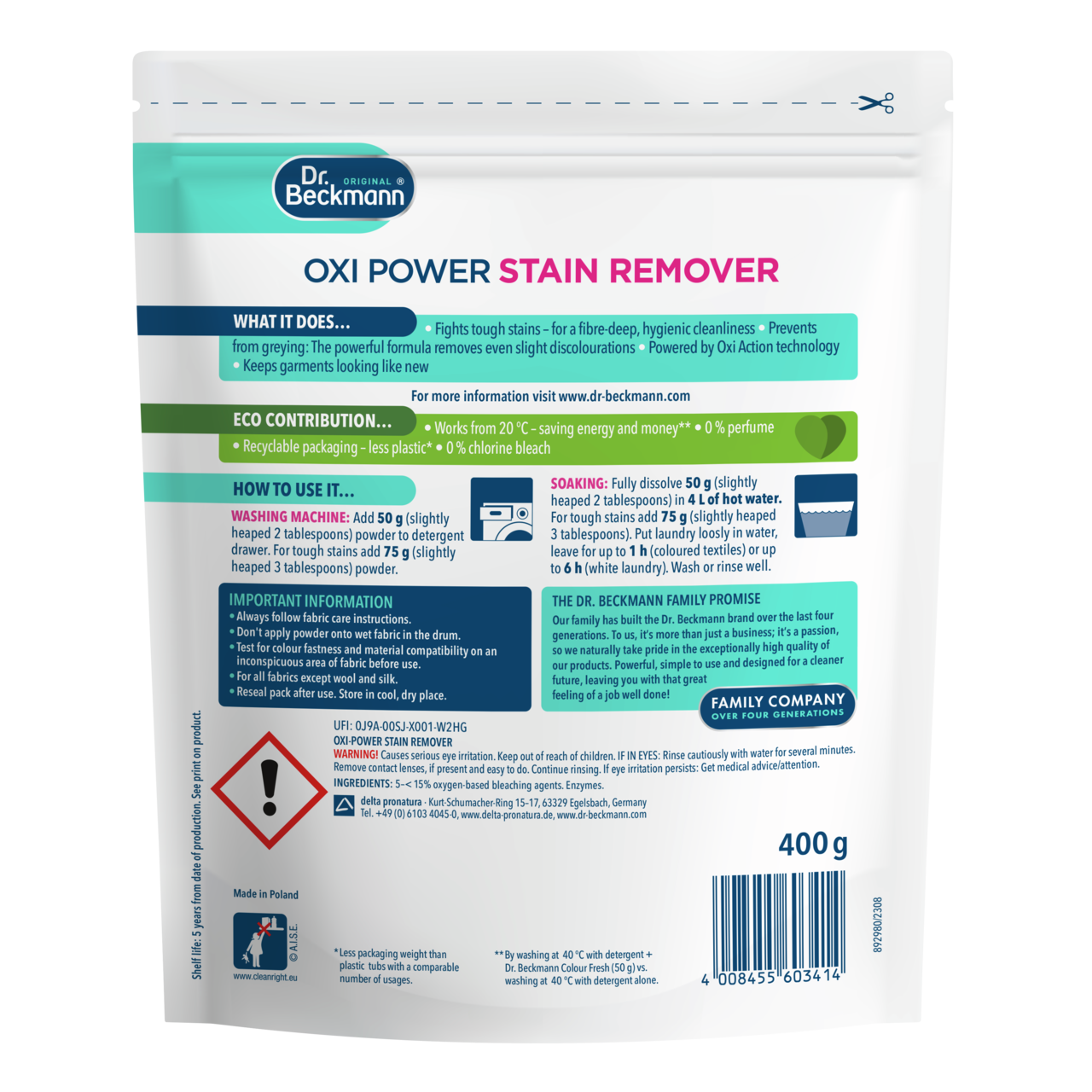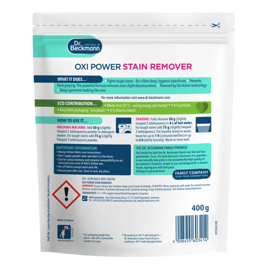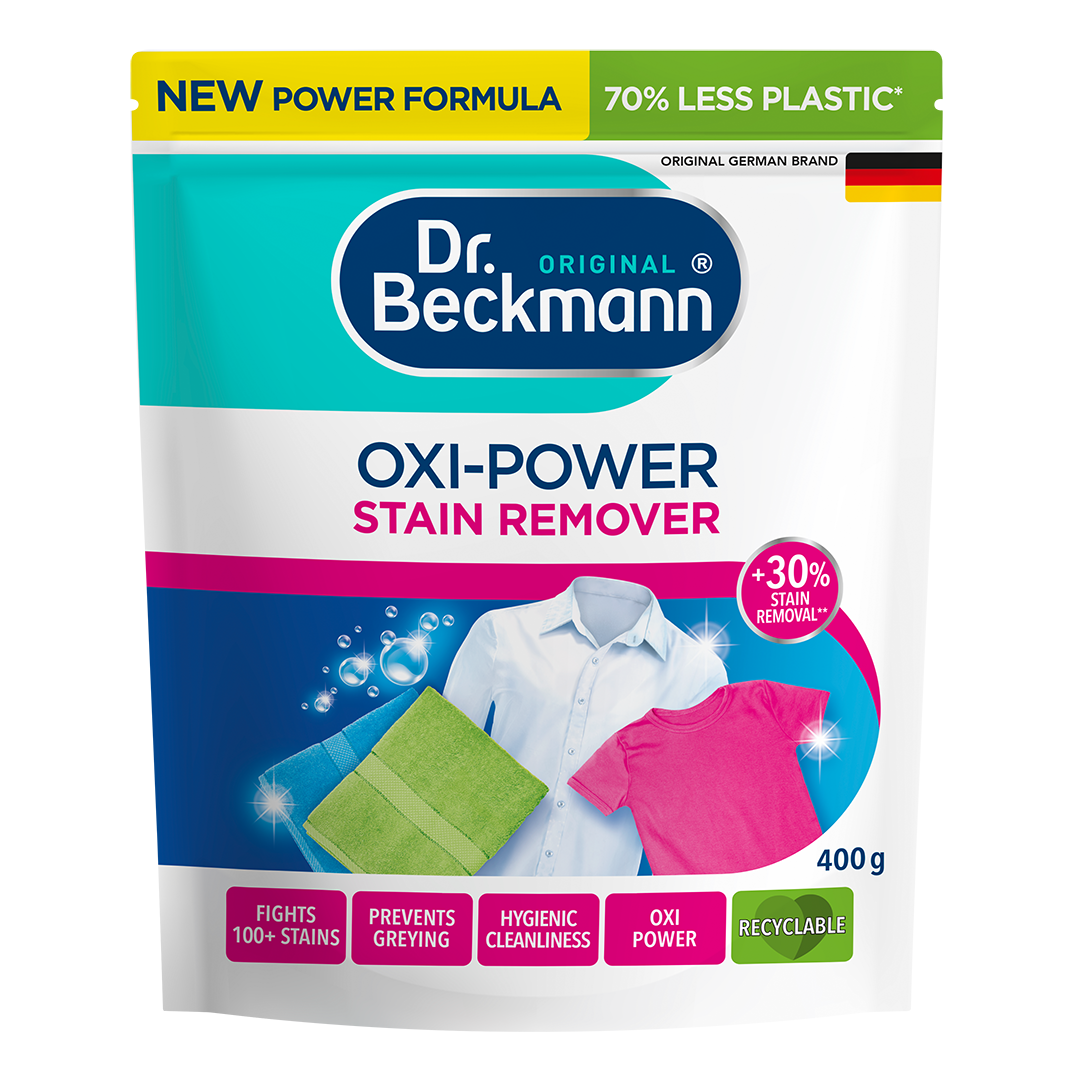 Especially with water-soluble products, watertight, airtight & resealable packaging is essential in order to preserve quality, shelf life and effectiveness. A stand-up pouch made of plastic is particularly suitable for this and has proven and established itself for detergents and household cleaning products. Compared to conventional wash booster in plastic tubs (with a comparable number of wash loads per packaging unit), Dr. Beckmann Oxi Power Stain Remover already manages with 70% less packaging material. We are already working on packaging options made of more environmentally friendly materials, but unfortunately we can't do without plastic at the moment.