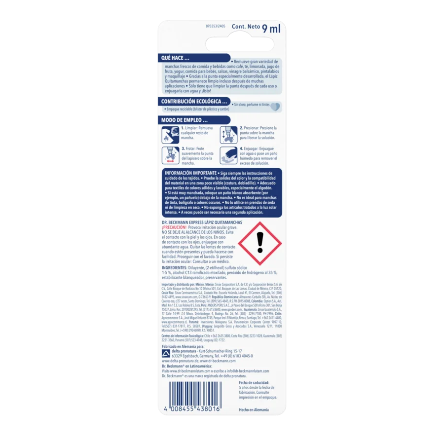 Dr. Beckmann Lápiz Quitamanchas Express puede ser una solución práctica para manchas que aparecen cuando estás fuera de casa. Las manchas recientes se pueden tratar con una combinación de tensoactivos y oxígeno activo. La punta permite aplicar de forma precisa y, después de lavarla, se puede reutilizar sin dejar residuos.