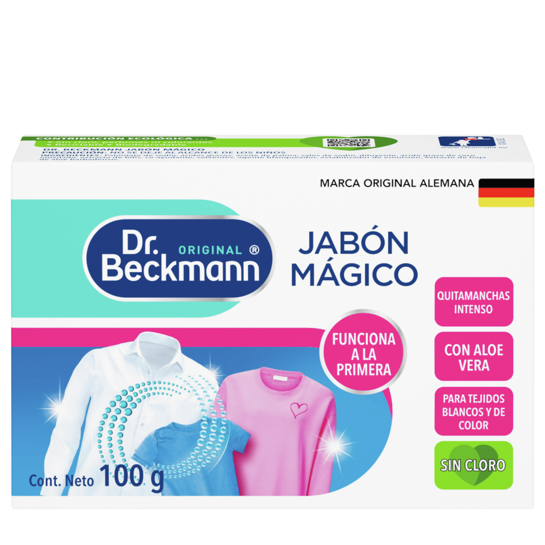 Dr. Beckmann Jabón Mágico ayuda a quitar muchas manchas, incluso difíciles, en textiles lavables y no lavables, tapicerías y alfombras. Frota el producto directo sobre la mancha; para manchas grandes, usa la base con textura tipo tabla de lavar y, para zonas específicas, usa las puntas. Elimina muchas manchas, como aceite de cocina o de ensalada, maquillaje, labial, sangre, suciedad en cuellos y puños, grasa y muchas más.