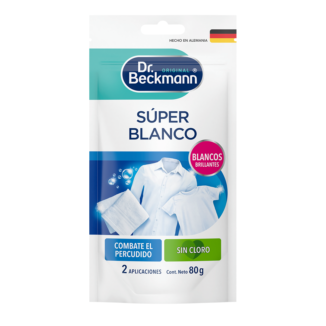 El polvo de Súper Blanco de Dr. Beckmann ayuda a mantener el brillo de tu ropa blanca y está formulado para cuidar las fibras y los tejidos. Puedes usarlo en cada lavado para un blanco más brillante. Funciona con distintos tipos de tejidos y en cualquier ciclo o temperatura, incluso a 20 °C.