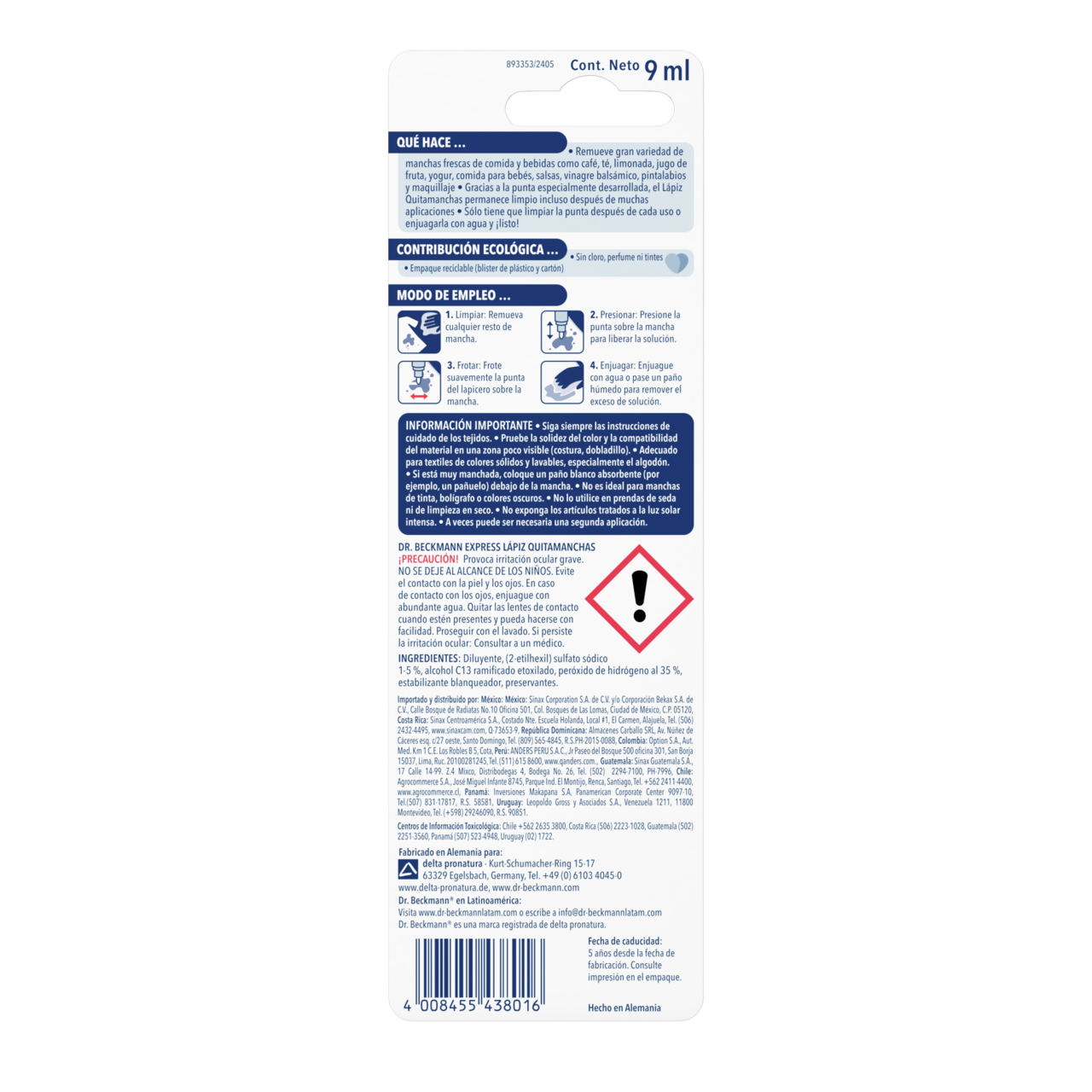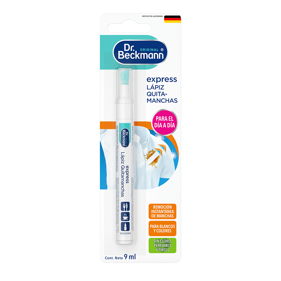 Dr. Beckmann Lápiz Quitamanchas Express puede ser una solución práctica para manchas que aparecen cuando estás fuera de casa. Las manchas recientes se pueden tratar con una combinación de tensoactivos y oxígeno activo. La punta permite aplicar de forma precisa y, después de lavarla, se puede reutilizar sin dejar residuos.
