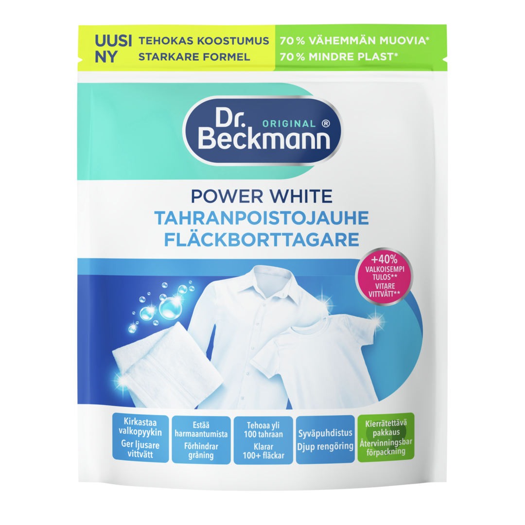 Vesi- ja ilmatiivis sekä suljettava pakkaus on erityisen tärkeää erityisesti vesiliukoisille tuotteille niiden laadun, käyttöiän ja tehokkuuden säilyttämiseksi. Muovista valmistettu pystypussi sopii erityisen hyvin tähän, ja se on testattu ja käytössä hyväksi havaittu pakkaus puhdistusaineille ja kodin puhdistustuotteille. Verrattuna muovipurkeissa myytäviin pyykinpesun tehostajiin (jotka riittävät vastaavaan määrään pesukertoja), Dr. Beckmann Power White tahranpoistojauheen pakkaukseen käytetään 70 % vähemmän pakkausmateriaalia. Työskentelemme jo ympäristöystävällisemmistä materiaaleista valmistettujen pakkausvaihtoehtojen kehittämiseksi, mutta valitettavasti emme voi luopua muovista tällä hetkellä.