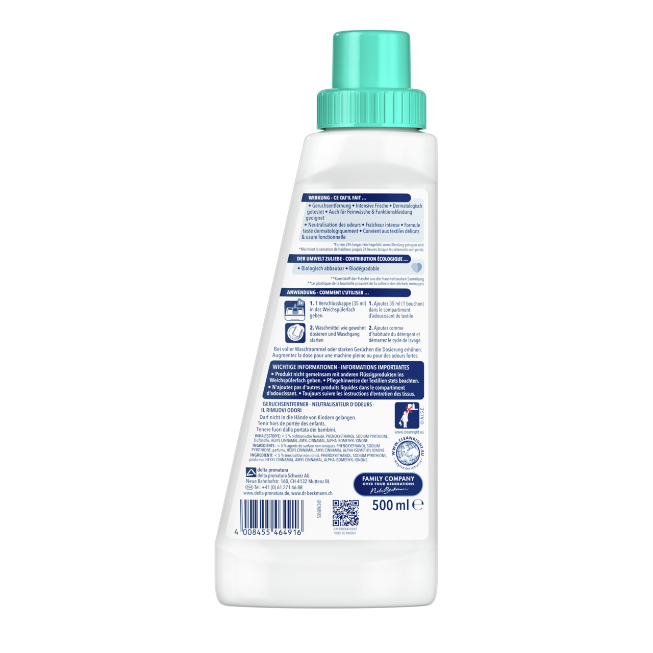 Le produit Dr. Beckmann Neutralisateur d'odeurs_contient une formule anti-odeurs qui élimine activement les odeurs tenaces du plus profond des fibres du tissu. Les gélules de dépôt de fraîcheur s'attachent aux fibres et s'ouvrent lorsque les vêtements sont portés, neutralisant ainsi les odeurs nouvellement émergentes avant qu'elles ne puissent s'attacher aux fibres.