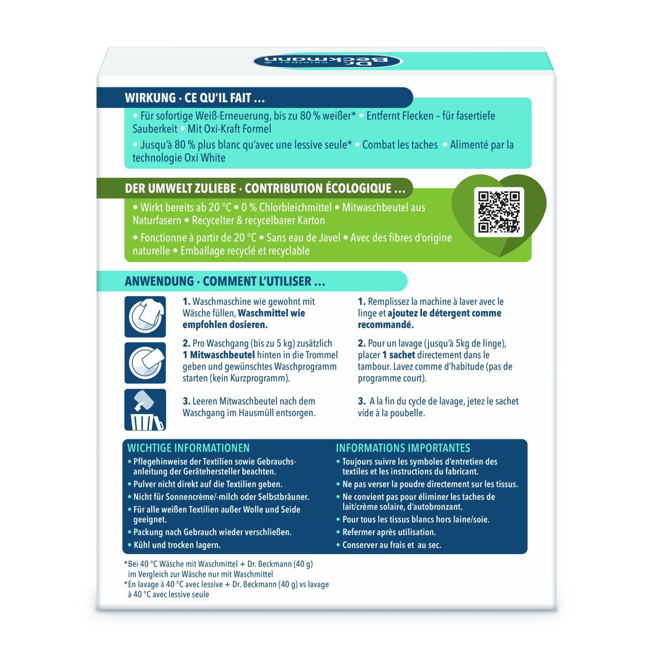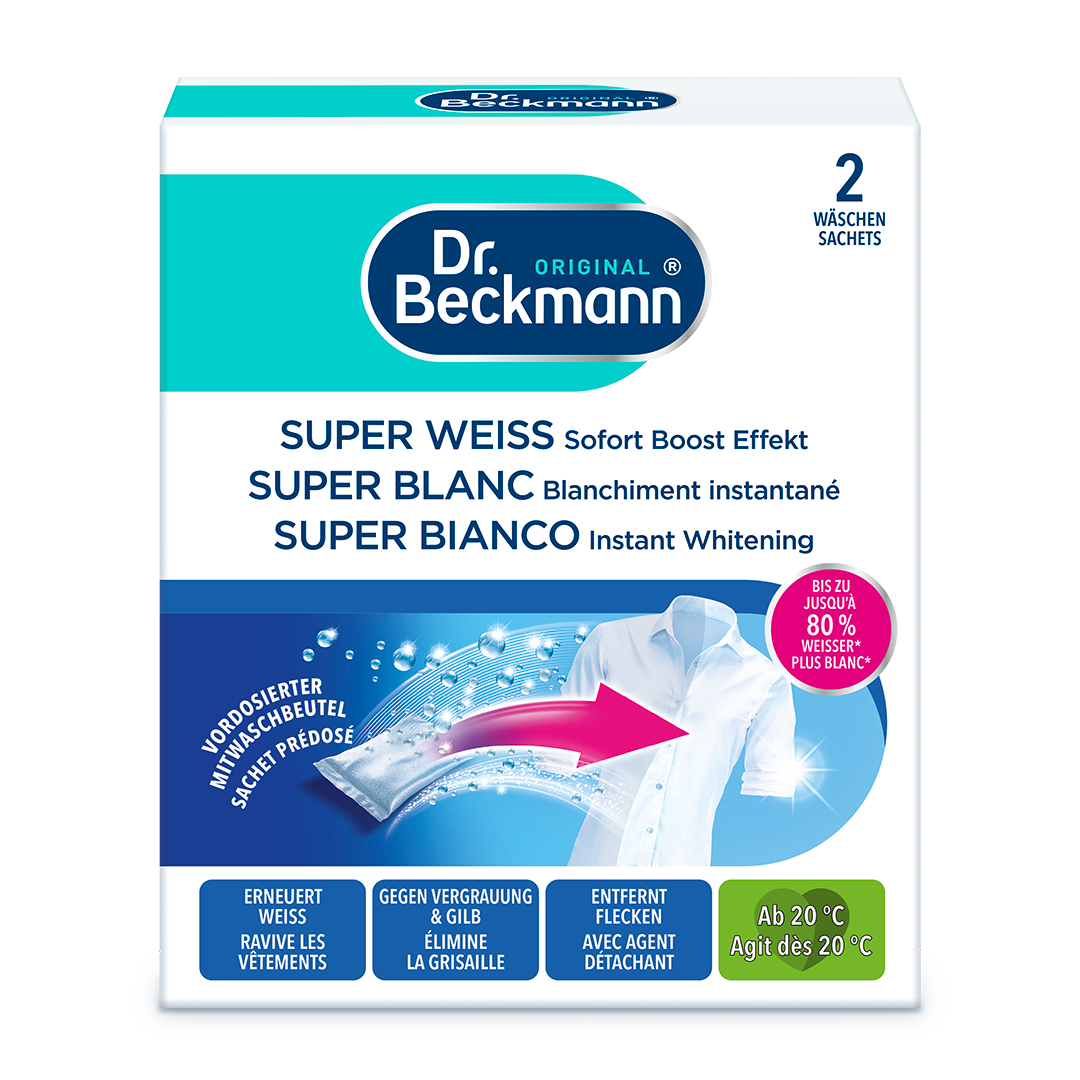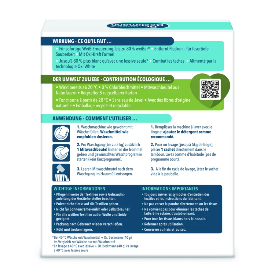Au fil des lessives, le linge blanc perd son éclat, il jaunit et se ternit. Les basses températures de lavage ou les dépôts de calcaire dans la lessive en sont la cause. Le Super Blanc Reblanchisseur de Dr. Beckmann ravive instantanément le blanc. La technologie "Oxi Blancheur" donne une nouvelle vie à vos vêtements préférés, serviettes et linge de lit. Il combat les taches pour un nettoyage des fibres en profondeur. Les sachets Super Blanc Reblanchisseur fonctionnent dès 20 °C. Ils sont également sans eau de Javel. Les sachets prédosés, pratiques et faciles à utiliser, sont fabriqués avec des fibres d'origine naturelle. Ils sont livrés dans une boîte en carton recyclée et recyclable.Non conçu pour