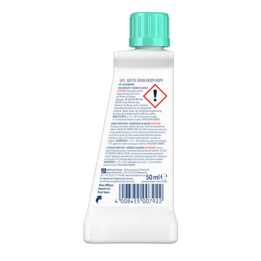 Dr. Beckmann Diable Détacheur Herbe et Cosmétiques a été spécialement conçu pour les taches très pigmentées, comme les taches de rouge à lèvres, de fond de teint ou d'herbe. La formule à base de substance dépigmentante et d’agents tensioactifs dissout les taches et les enlève en respectant les couleurs et le tissu.Idéal pour