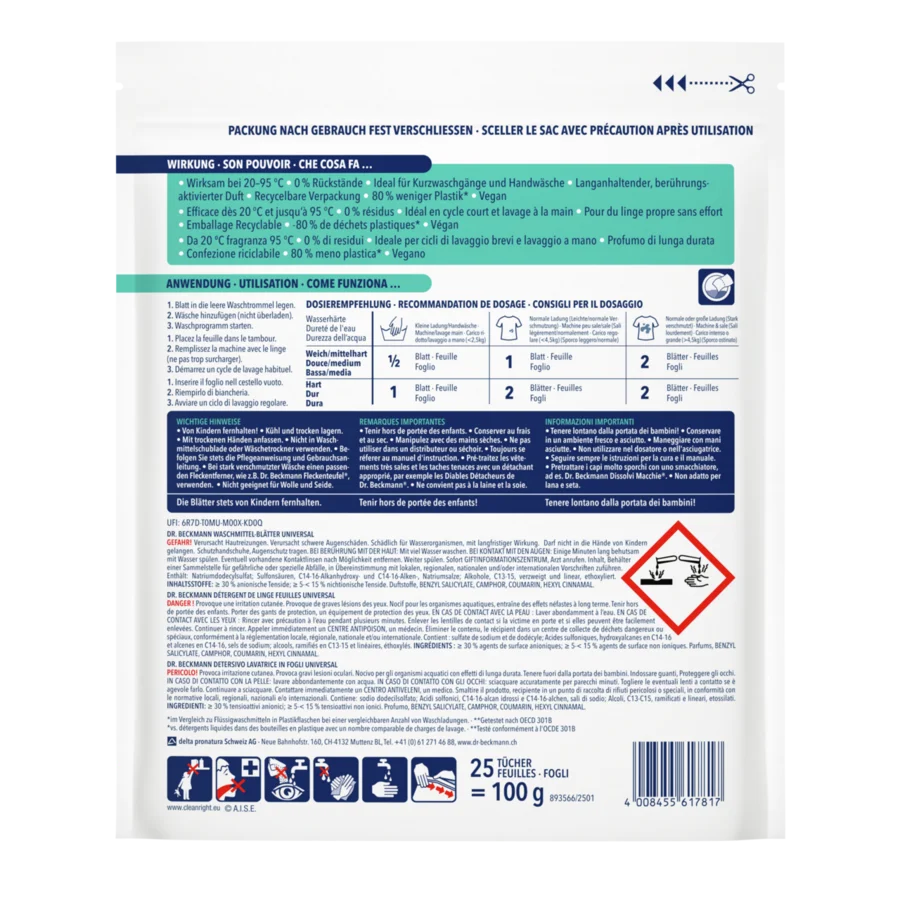Dr. Beckmann Détergent de linge feuilles_développe sa pouvoir de lavage dès 20°C. En cas de taches tenaces, nous recommandons un prétraitement avec un détachant tel que Dr. Beckmann Diable détacheur ou l'utilisation d'additifs de lavage tels que Dr. Beckmann Détachant avant lavage.