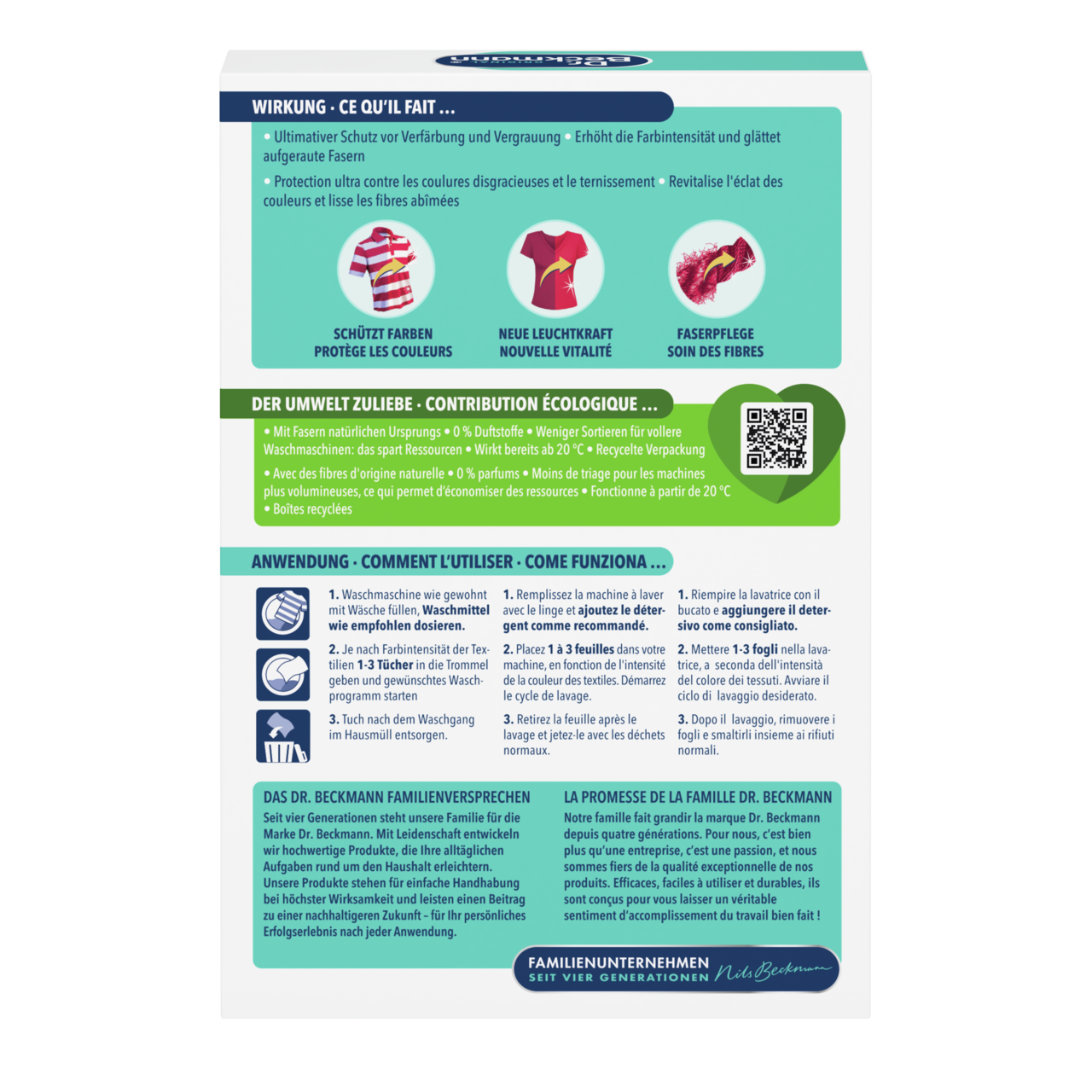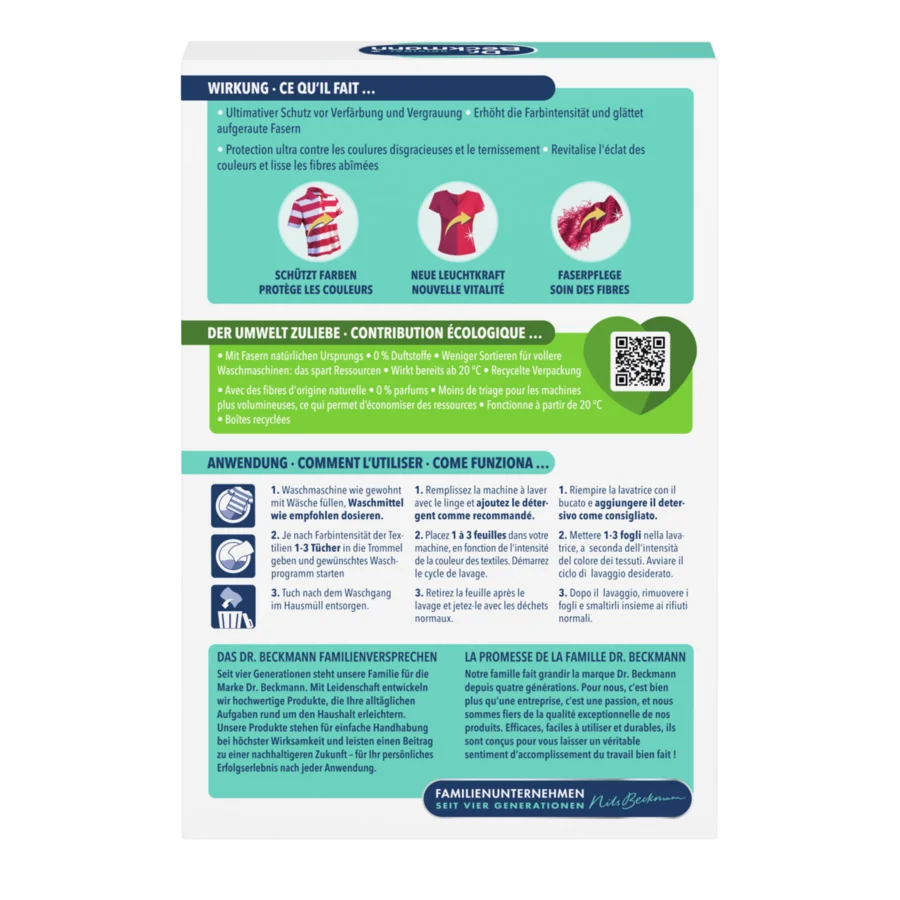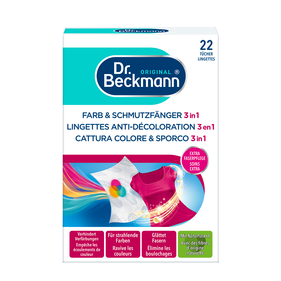 Dr. Beckmann Lingettes anti-décoloration 3en1 protège tous les tissus lavables des coulures de couleur. De plus, des enzymes de soin supplémentaires améliorent l'éclat des couleurs sur les fibres naturelles comme le coton, les mélanges de coton, la viscose, le tencel et le modal.
