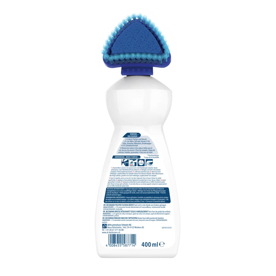 Dr. Beckmann Brosse Détachante Tissu d'Ameublement offre une utilisation plus facile et plus rapide que les produits conventionnels grâce à la brosse triangulaire douce 2 en 1 intégrée : l'éponge au centre répartit uniformément le détachant en activant l'oxi-power, tandis que les poils font pénétrer le produit en douceur dans le tissu. Grâce à la forme triangulaire, vous pouvez atteindre tous les coins et autres zones difficiles d'accès.