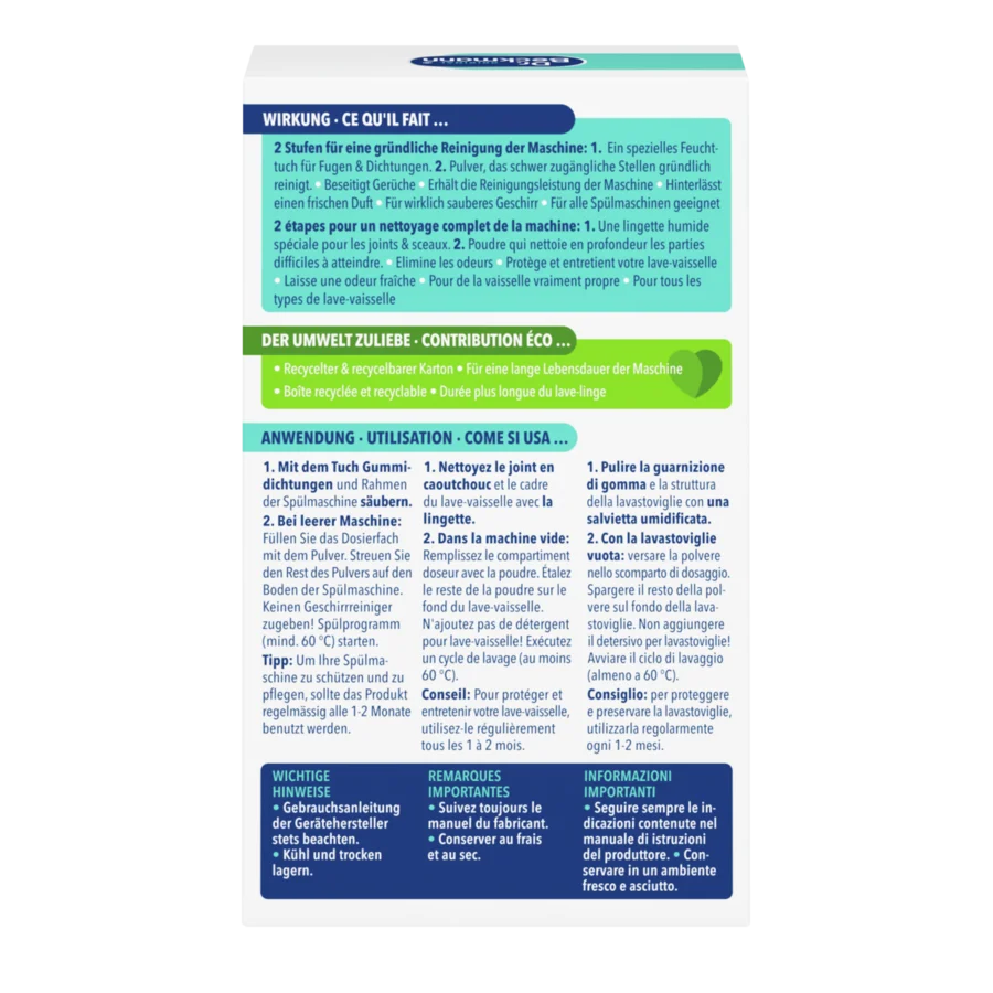 Au fil du temps, des résidus de saleté et de graisse peuvent se déposer à différents endroits du lave-vaisselle. Cela peut entraîner des odeurs désagréables ou même des dysfonctionnements du lave-vaisselle. C'est pour cela qu'il existe Dr.Beckmann Nettoyant Hygiène Lave-Vaisselle. Dans une premiere étape, la lingette de nettoyage entretient les joints et les bords de la porte. Dans une deuxième étape, la poudre nettoie en profondeur l'intérieur de la machine et élimine les odeurs. Une propreté intensive de votre lave-vaisselle est ainsi assurée.