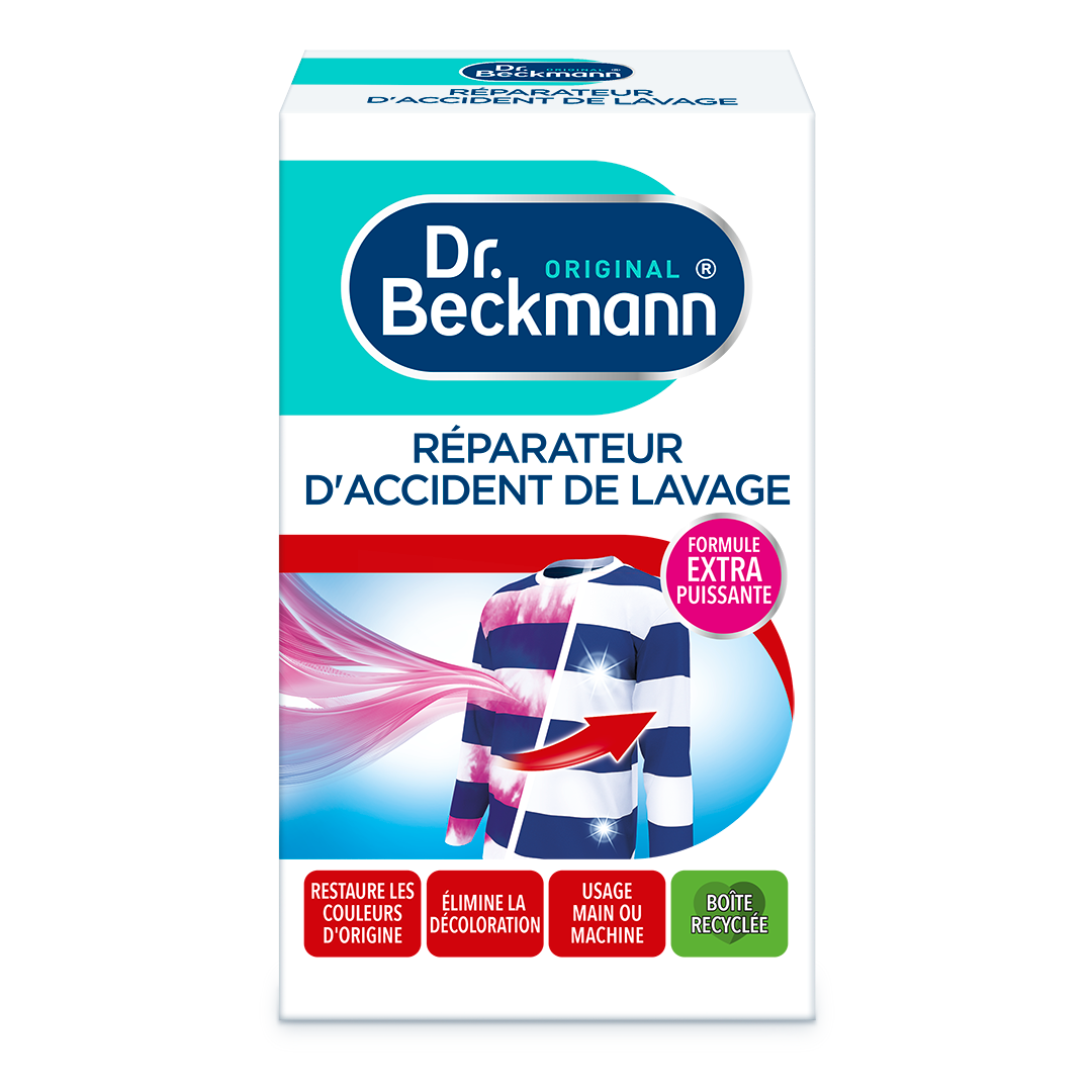 Les vêtements de couleur vive peuvent vite entraîner des décolorations lorsqu'ils sont lavés ensemble par mégarde. Les couleurs déteignent et colorent tout le linge. Dr. Beckmann Réparateur d'accident de lavage permet de restaurer les couleurs d'origine. Les composants spéciaux éliminent les colorations non voulues. Les vêtements retrouvent leur aspect d'origine après la décoloration.
