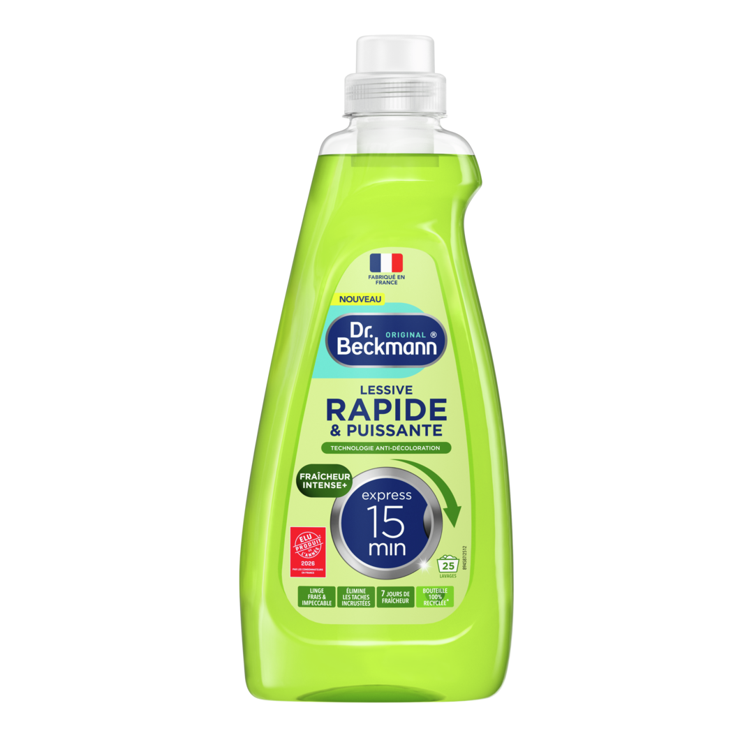 La nouvelle gamme Dr. Beckmann Cycle Court établit une nouvelle norme de performance en offrant un linge impeccable en un rien de temps. Alors que les détergents traditionnels nécessitent de longs cycles de lavage pour éliminer la saleté et les taches, notre technologie avancée Cycle Court permet d'obtenir un nettoyage en profondeur en seulement 15 minutes, sans compromis sur les performances.